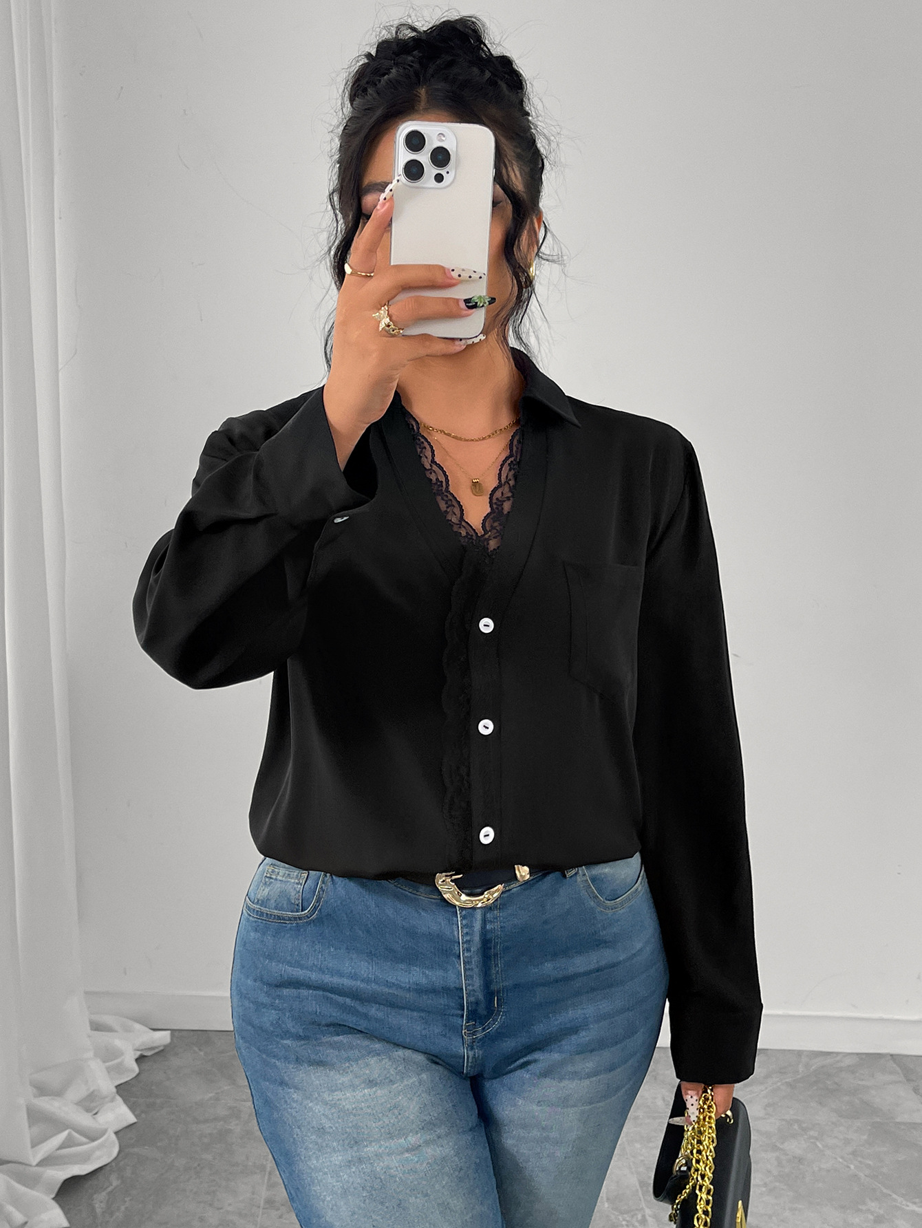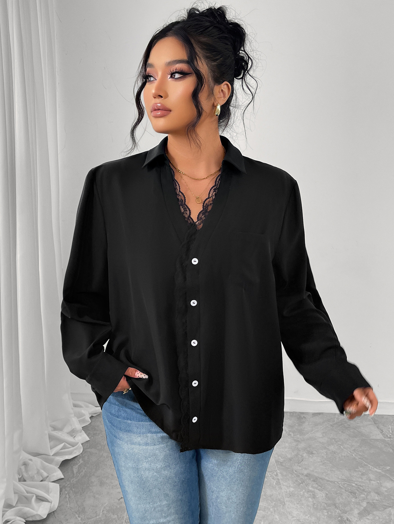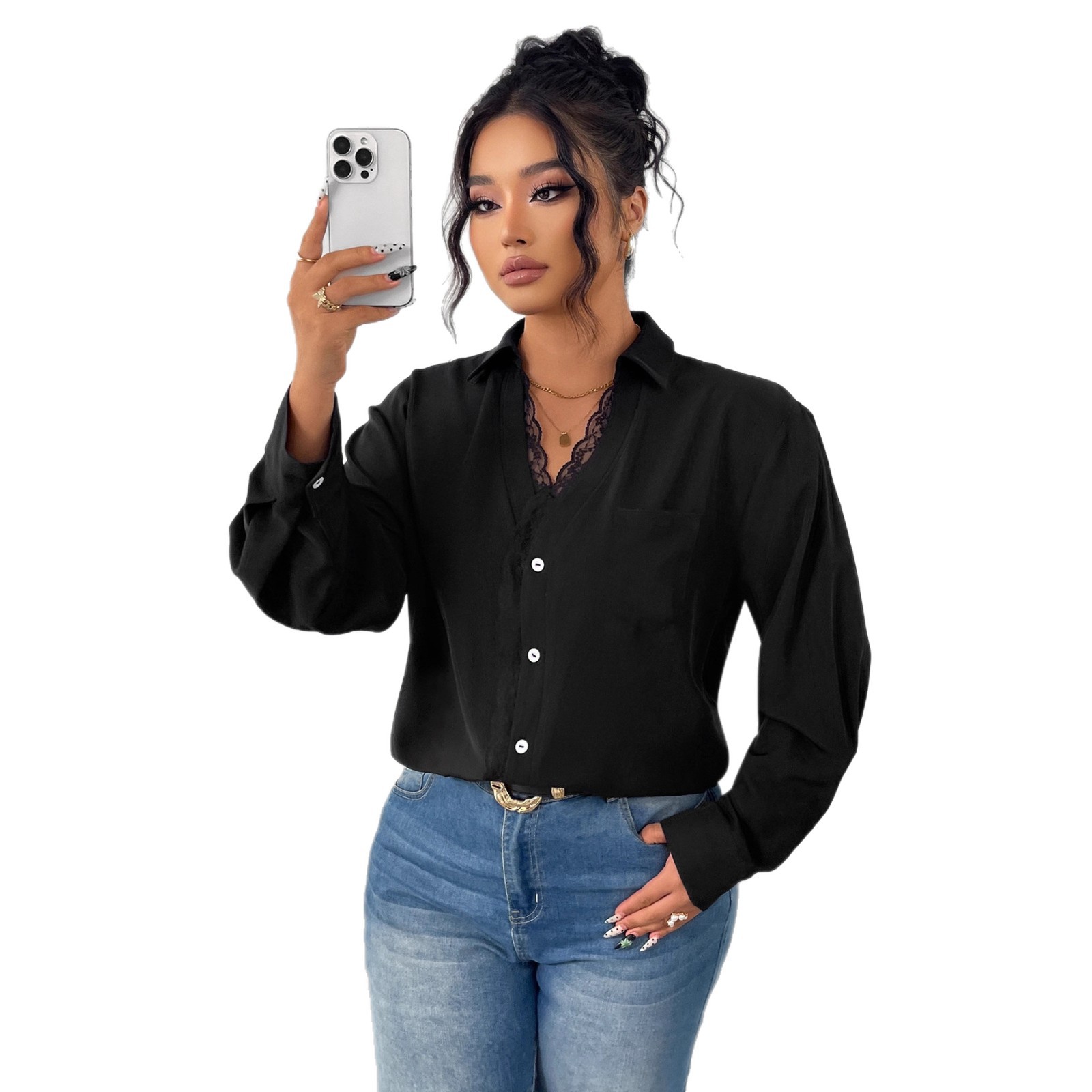 Long Sleeve Chiffon Blouse With Lace Craft