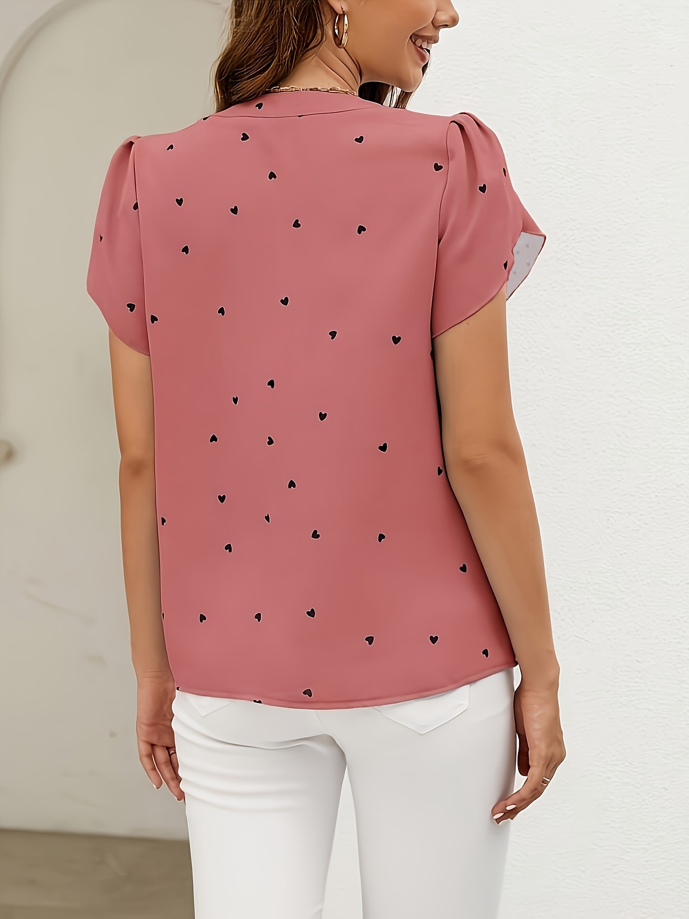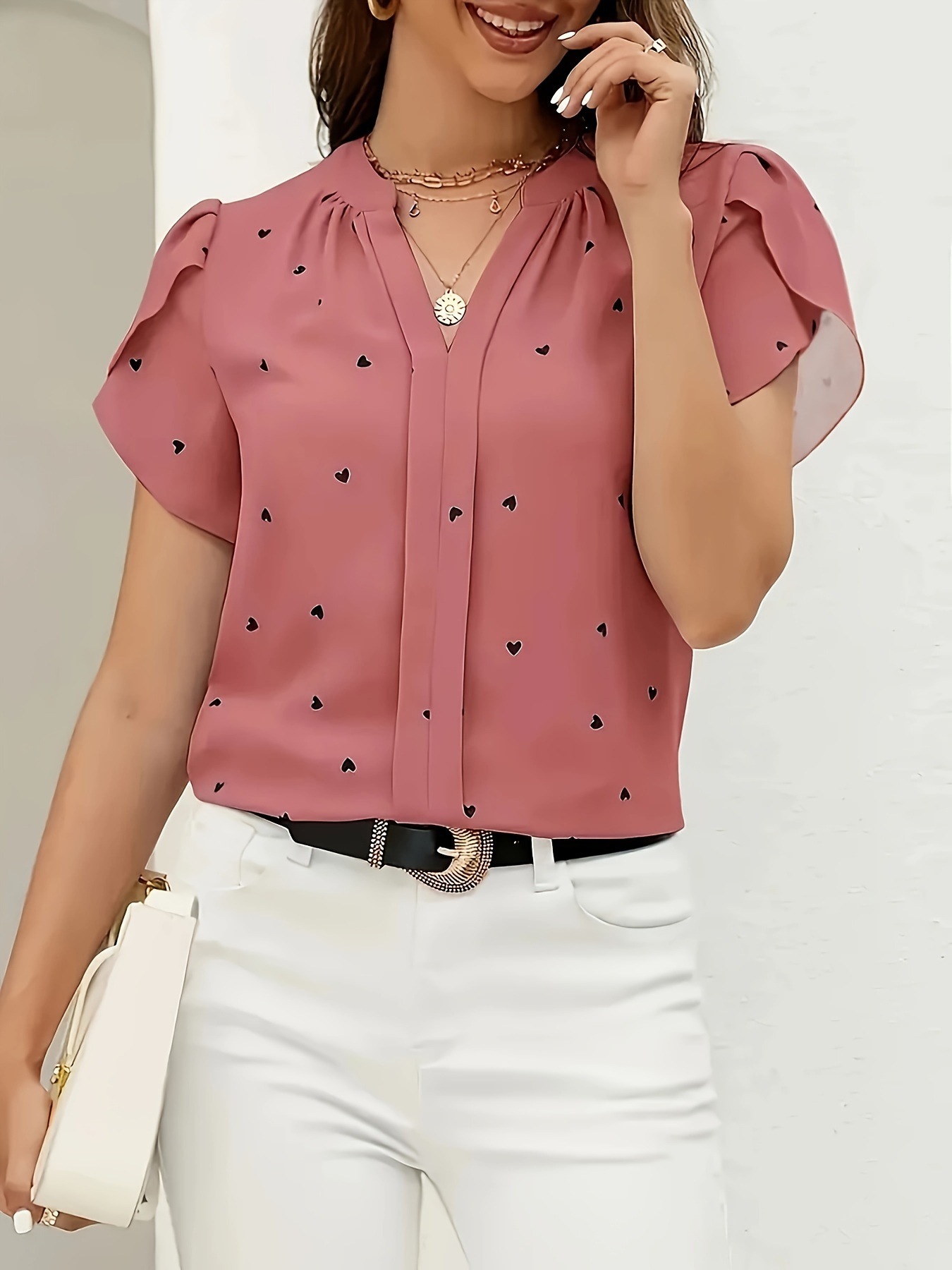 Size: S change S M L XL Color: Red change This independent station women’s printed V-neck top blends a fresh, sweet aesthetic with a gentle, feminine style. Designed with a slim fit, it softly contours the body while remaining light and comfortable for everyday wear. The charming heart pattern adds a romantic touch, making the top youthful yet elegant. Crafted from high-quality polyester (95% and above), the fabric is lightweight, breathable, and easy to care for—perfect for warm-weather styling. The ruffle short sleeves bring subtle movement and softness, enhancing the overall graceful look. With an ordinary-length cut (50–65cm), this top pairs effortlessly with jeans, skirts, or shorts, making it suitable for casual outings, dates, or daily wear. Whether worn alone or layered, it’s a versatile wardrobe essential for women who love sweet, polished fashion with a modern twist.