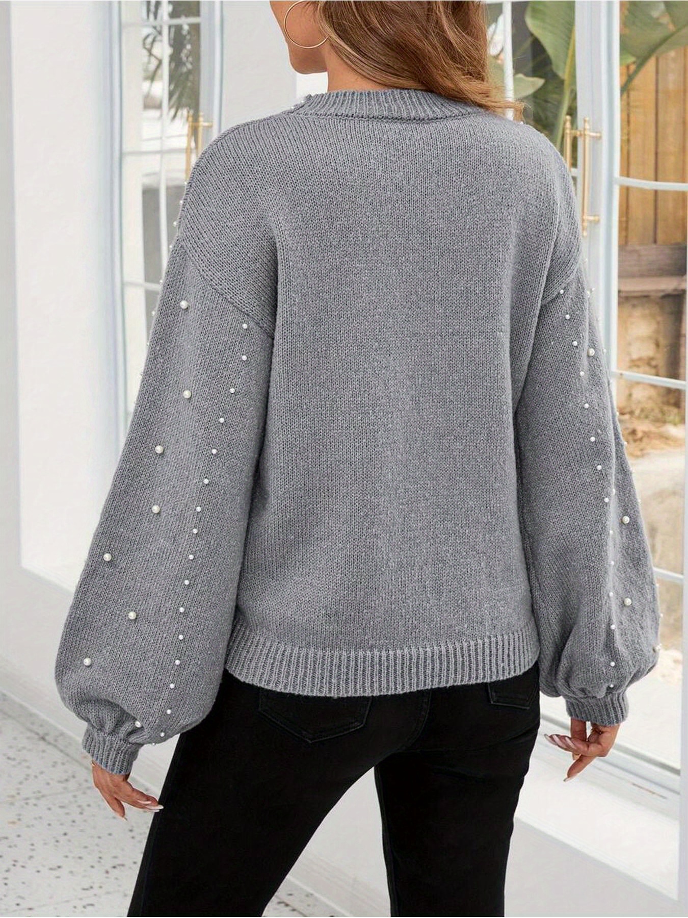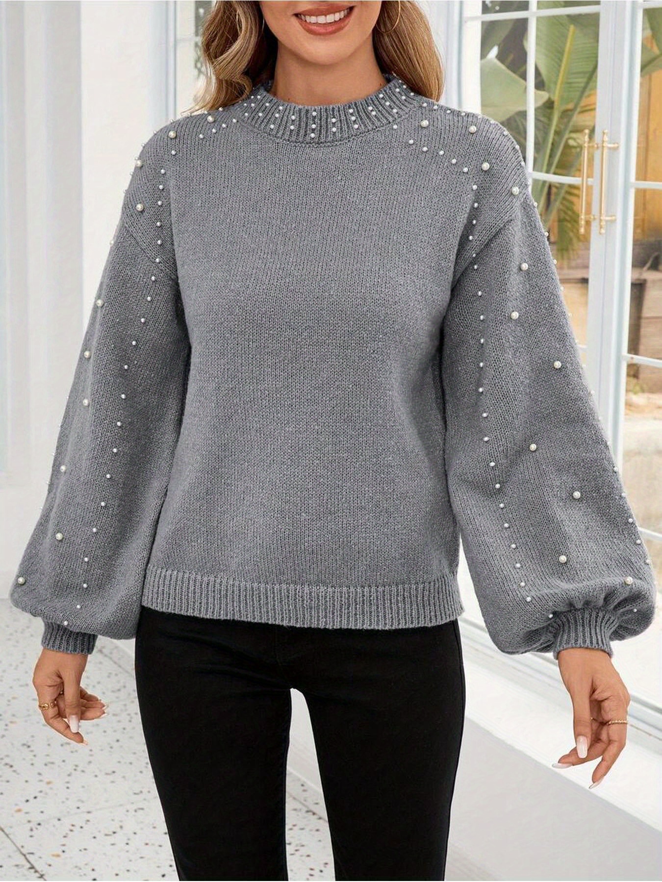 Size: S change S M L XL XXL Color: Grey change The Casava Luma Pearl Lantern Sleeve Sweater brings effortless elegance to everyday wear. Crafted from soft knitted polyester, this loose yet balanced fit pullover features a stand-style turtleneck, lantern sleeves, and subtle beaded detailing for a refined casual look. Designed for autumn and winter, it offers cozy comfort with a touch of sophistication for daily styling.