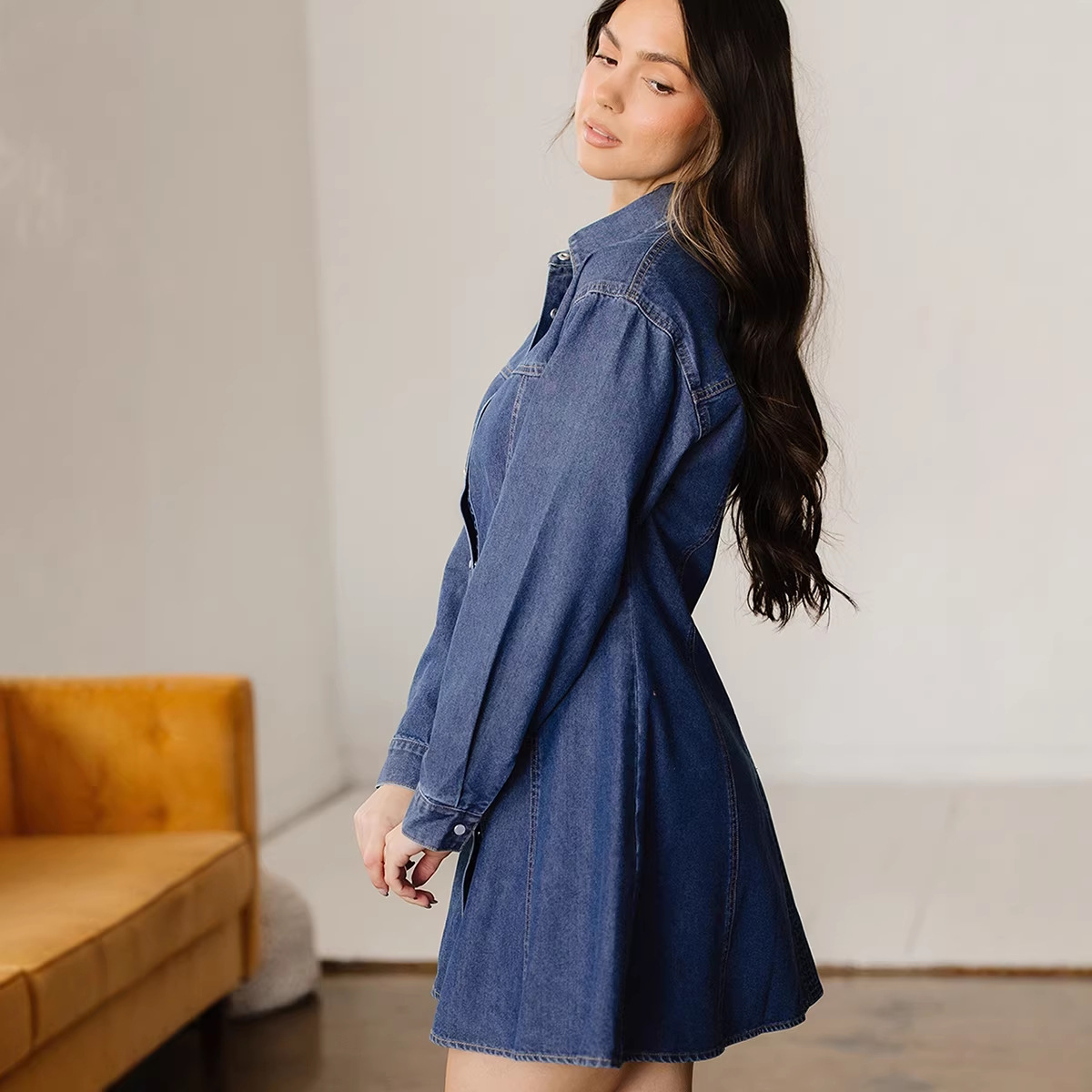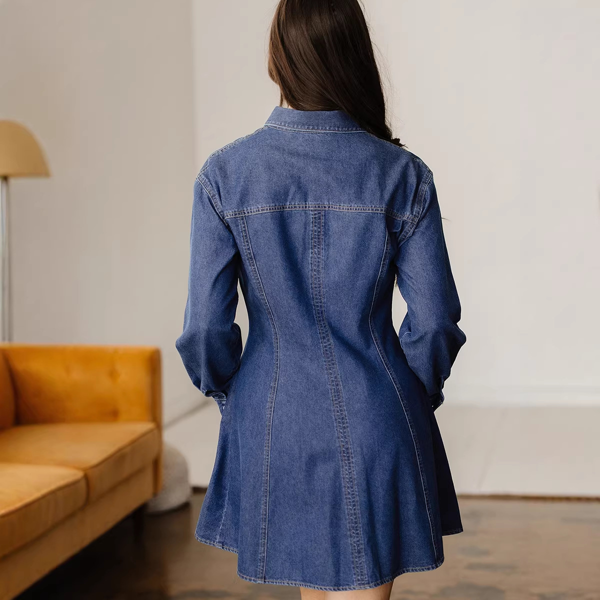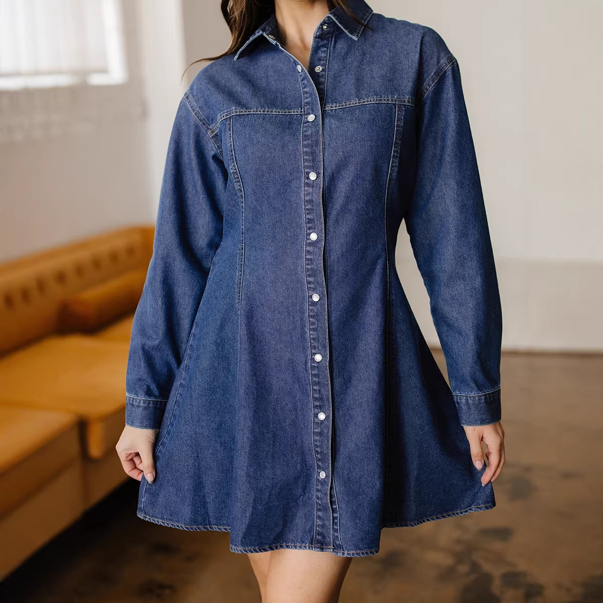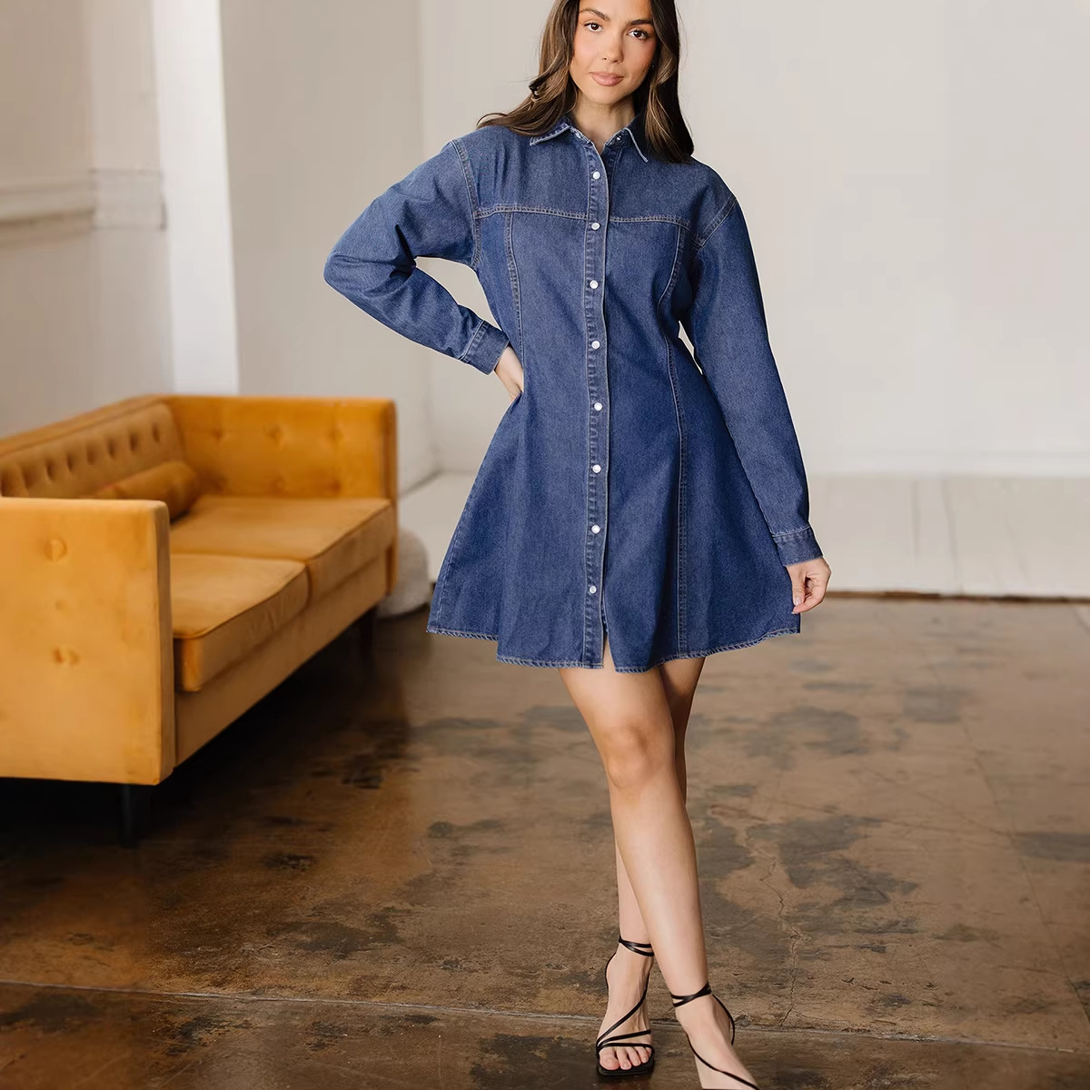 Casual Denim Dress With Long Sleeve And Lapel Neckline