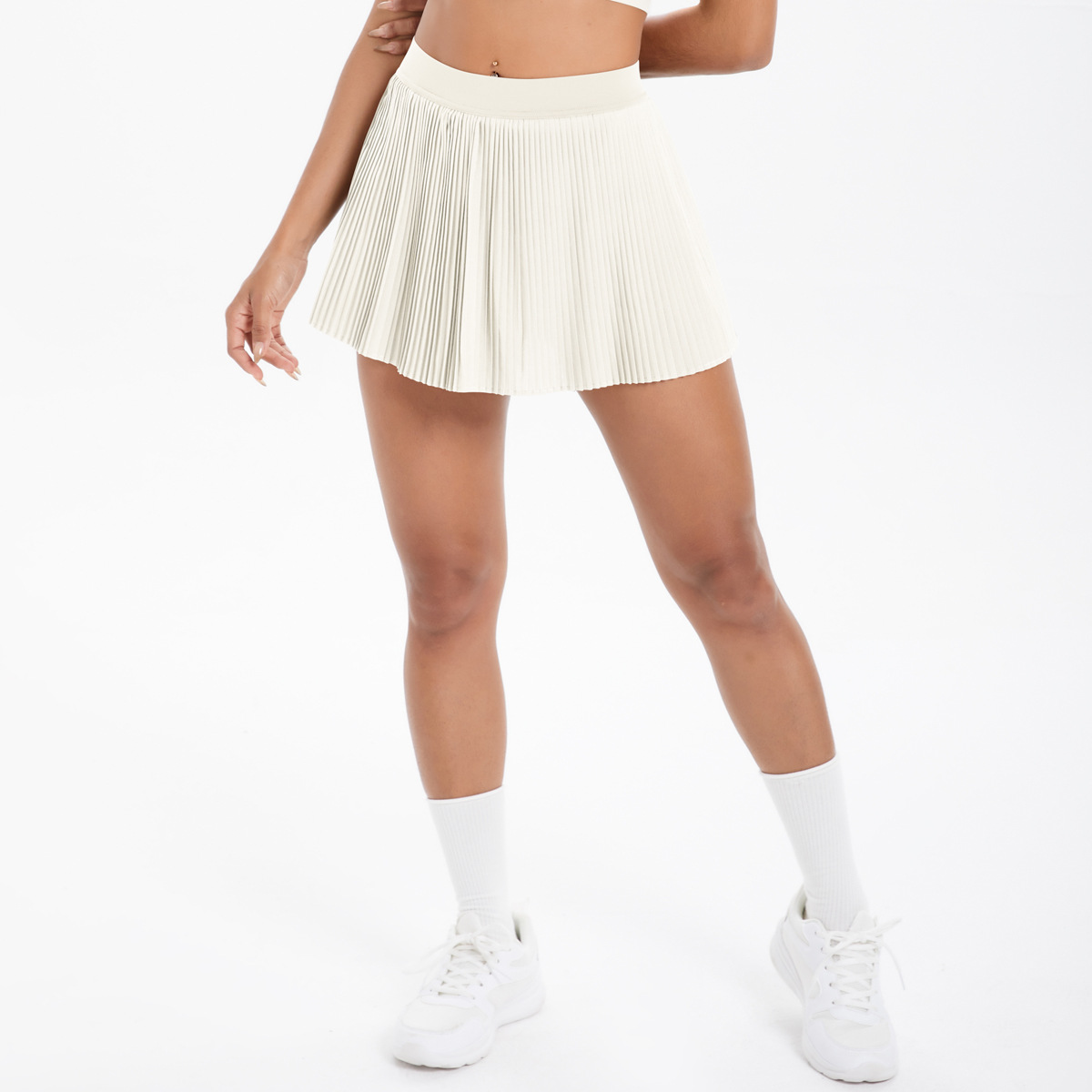 The Casava Crimp Pocket Two-Piece Set is a sporty women's yoga outfit featuring a high-waist skirt and multifunctional culottes. Made from stretchy nylon and spandex, it’s perfect for running, fitness, and active workouts, with a stylish stripe design and sleeveless top.