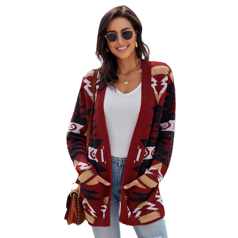 The Casava Geometric Cardigan combines warmth, comfort, and streetwear style in one cozy piece. Featuring a bold geometric pattern and functional pockets, this long cotton cardigan is perfect for layering during autumn and winter. With its soft texture, 3/4 sleeves, and flattering V-neckline, it’s ideal for daily wear or casual festive occasions like Christmas.