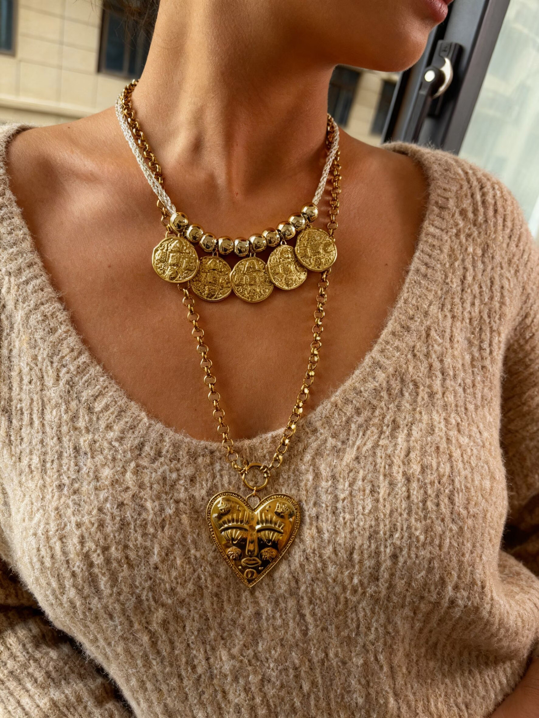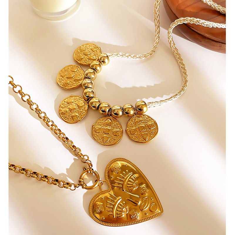 Size: na change Color: Gold change The Casava Golden Heart Aura Necklace is a stylish long-layered pendant chain crafted from durable 304 stainless steel and finished with a radiant 18K PVD gold coating. Featuring a heart-embossed round charm, braided cord detailing, and a comfortable hypoallergenic design, it adds a chic everyday touch—perfect for casual outings, dates, or daily wear.