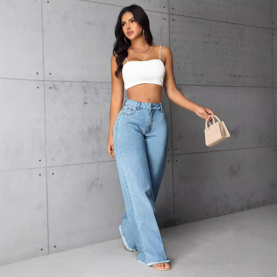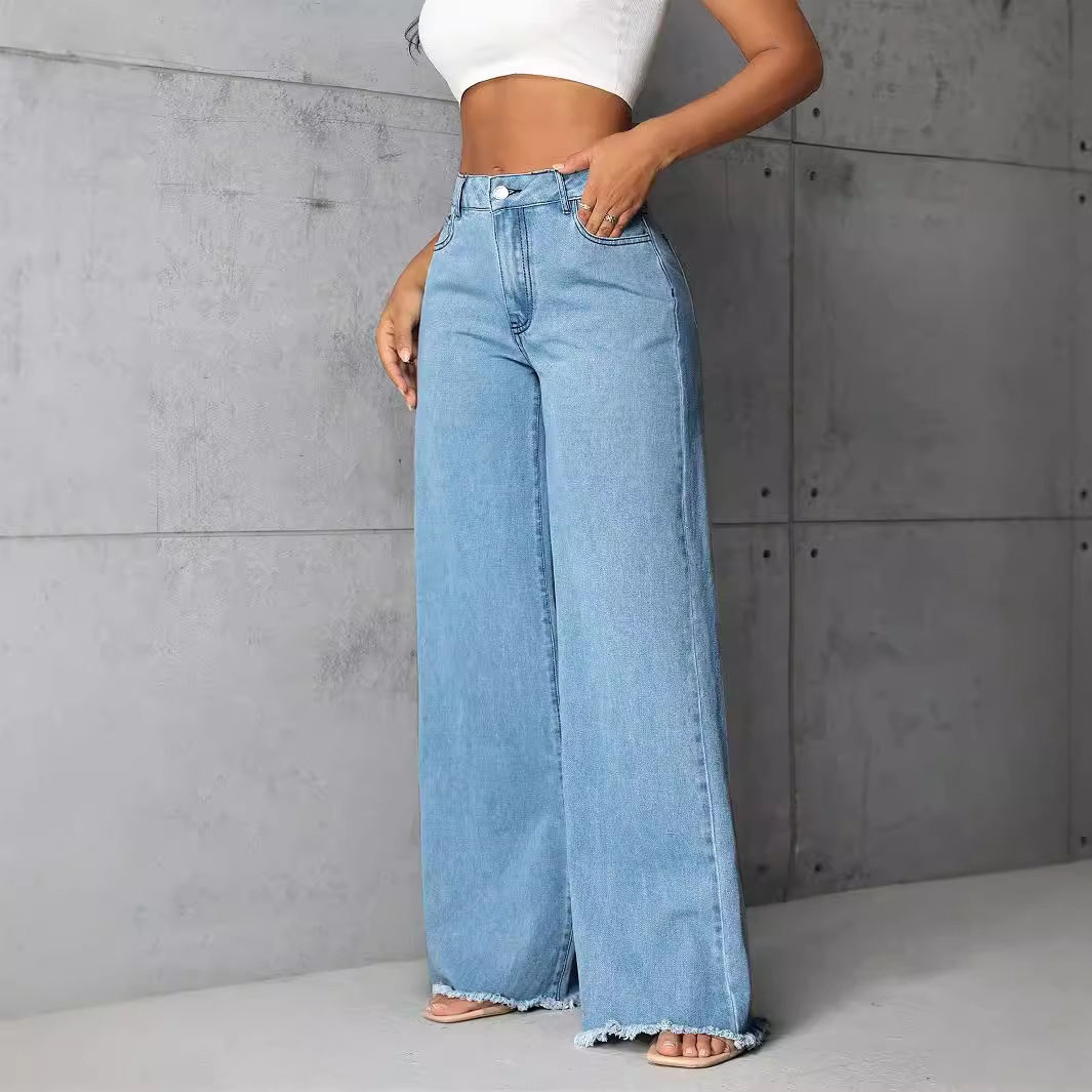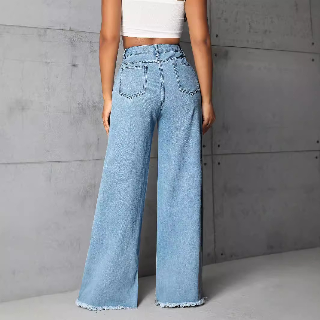 Size: XS change XS S M L Color: Blue change The Casava Cut Trousers deliver a modern European street-style look with their loose straight-cut design and full-length denim finish. Made from a comfortable cotton–polyester blend, these mid-waist trousers feature a clean non-ironing craft and button details, offering a stylish and effortless fit ideal for daily wear and trendy fashion moments.