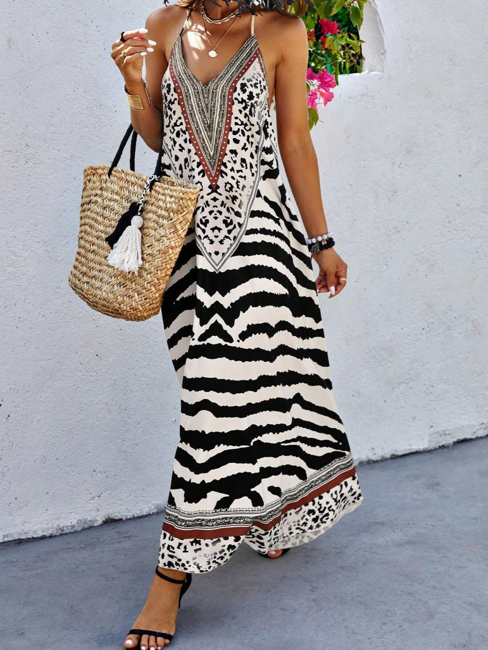 The Casava Animal Print Dress offers a bold zebra-patterned look with a chic backless halter-neck design. Lightweight and sleeveless, this maxi-length dress brings effortless elegance—perfect for beach days, summer outings, and eye-catching warm-weather style.