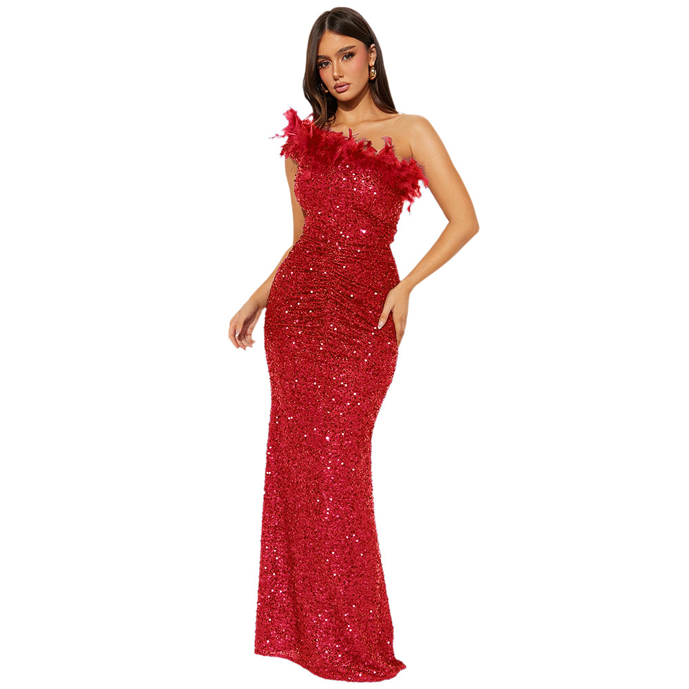 The Casava Feather Sequin Evening Gown is a statement piece that combines elegance with a subtle glamorous edge. Featuring a slim-fit silhouette, plunge neckline, and sleeveless design, this ankle-length dress is adorned with delicate feather patchwork and sequins for an eye-catching finish. Crafted from high-quality polyester, it’s perfect for formal events, business occasions, parties, and stylish evening outings.