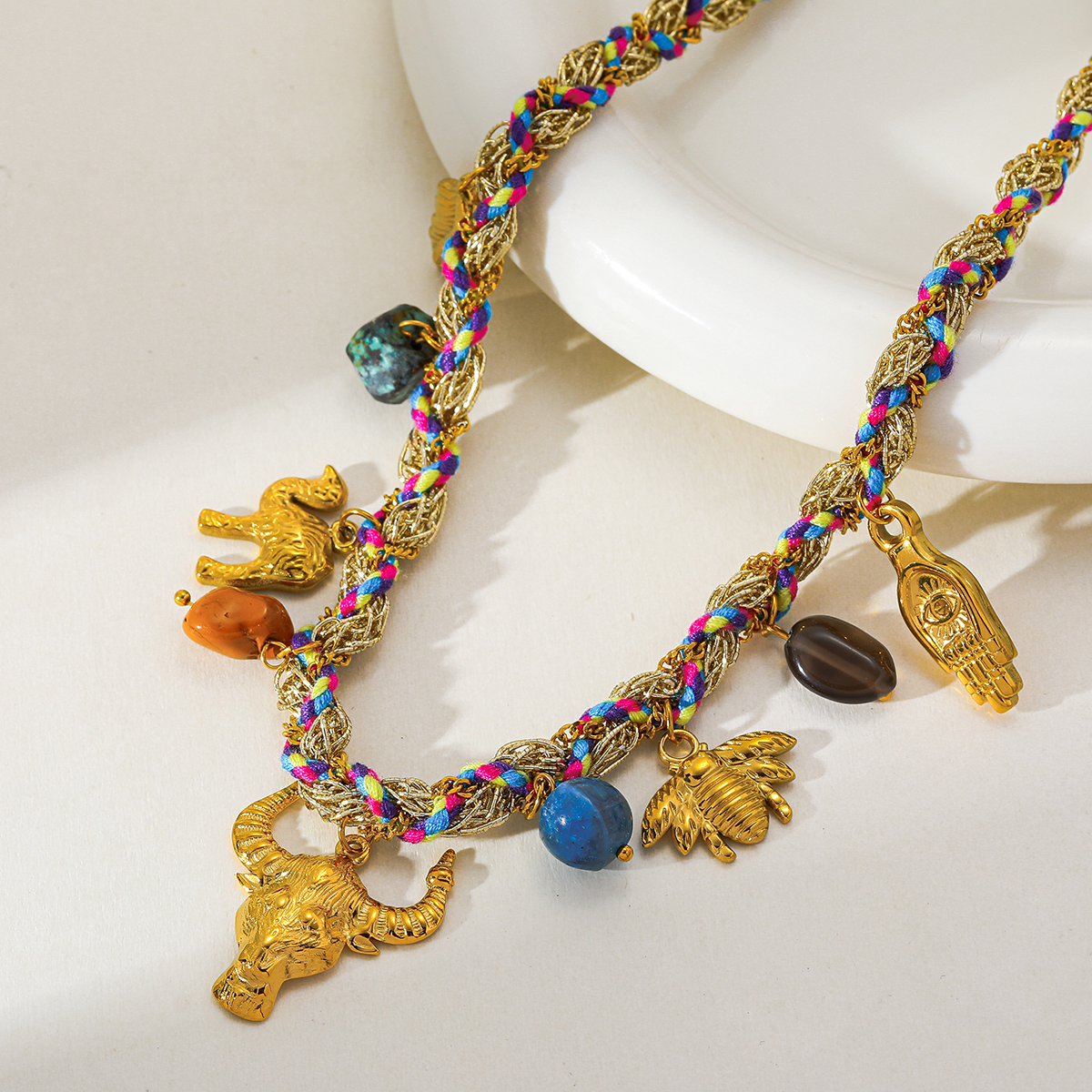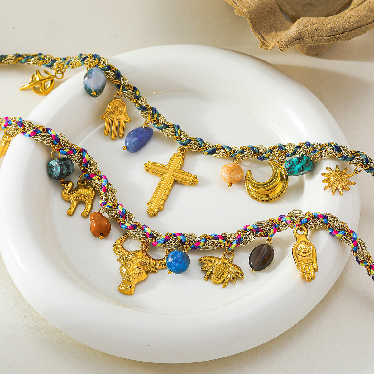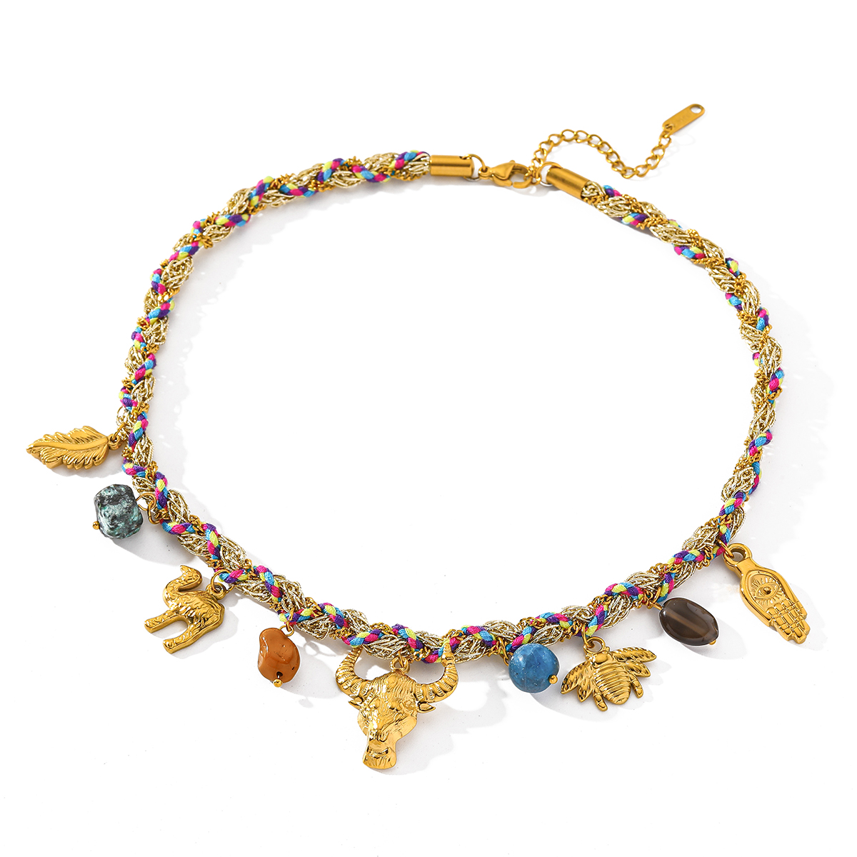 Comes a set as shown in images Size: 2-Length 41+5cm change Color: Multicolor change Add a touch of timeless elegance to your style with this beautifully crafted 18K gold-plated necklace. Designed with a mix of symbolic pendants—cross, moon, hand, bull head, and bee—it blends classic charm with fresh, modern appeal. Made from durable 304 stainless steel and accented with natural stone, this piece offers both quality and visual interest. The necklace features a combination of a Cuban link curb chain and wrapped cotton cord, creating a unique textured look that stands out while remaining effortlessly wearable. Its PVD-coated 18K gold plating ensures long-lasting shine and resistance to fading. Perfect for daily wear, selfies, festivals, and chic casual outfits, this necklace adds personality and sophistication to any look.
