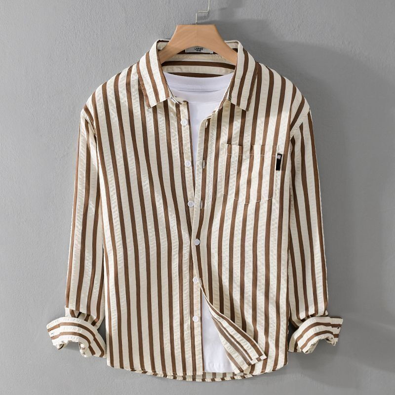 Featuring a regular fit and turndown collar, it offers a clean and modern silhouette suitable for casual outings or everyday wear. The striped pattern enhances the visual appeal, while the lightweight polyester-blend fabric ensures all-day comfort. Whether worn as a shirt or light cardigan, it’s a versatile piece that matches seamlessly with jeans, chinos, or layered looks.
