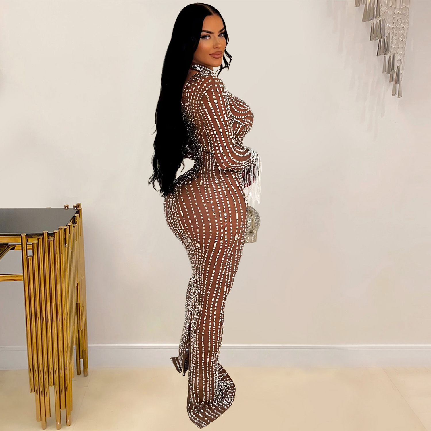 This Elegant Pure Color Mesh Dress is designed to make a refined statement. Featuring delicate hotfix rhinestone embellishments, a classic round neckline, and long sleeves, this ankle-length one-step dress blends sophistication with modern glamour. Its regular fit and lightweight mesh fabric make it ideal for formal occasions, evening events, and stylish celebrations where elegance is essential.