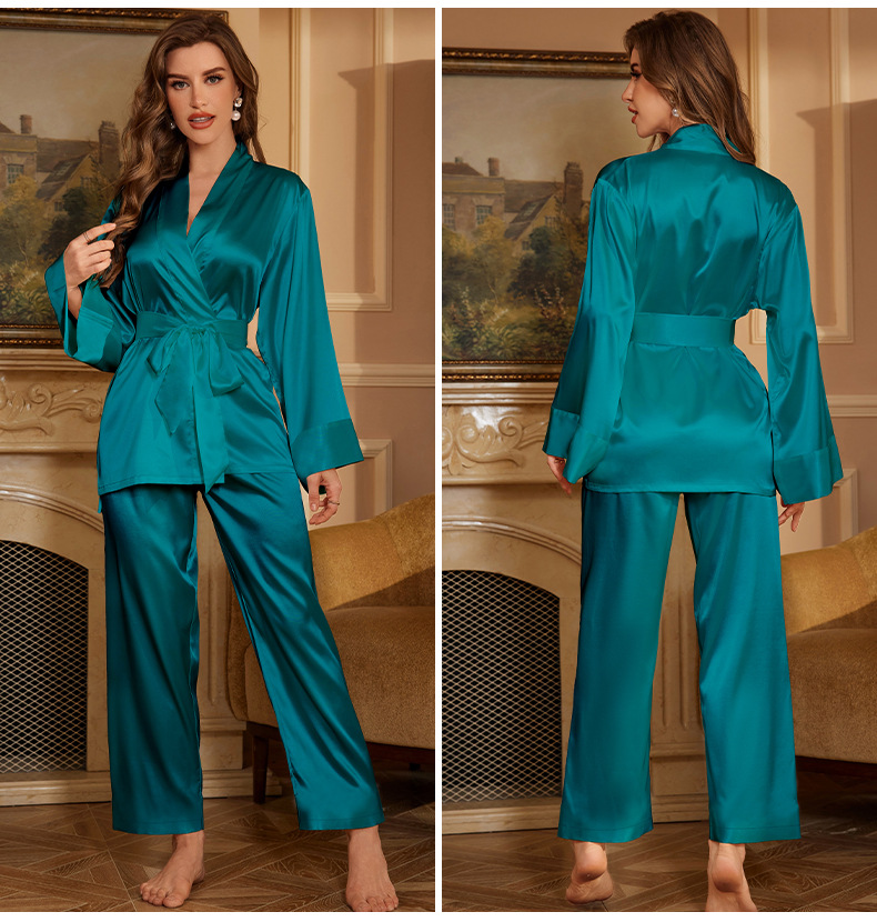 The set includes a luxurious robe-style top paired with long pants, offering a refined silhouette that feels light, airy, and incredibly comfortable.