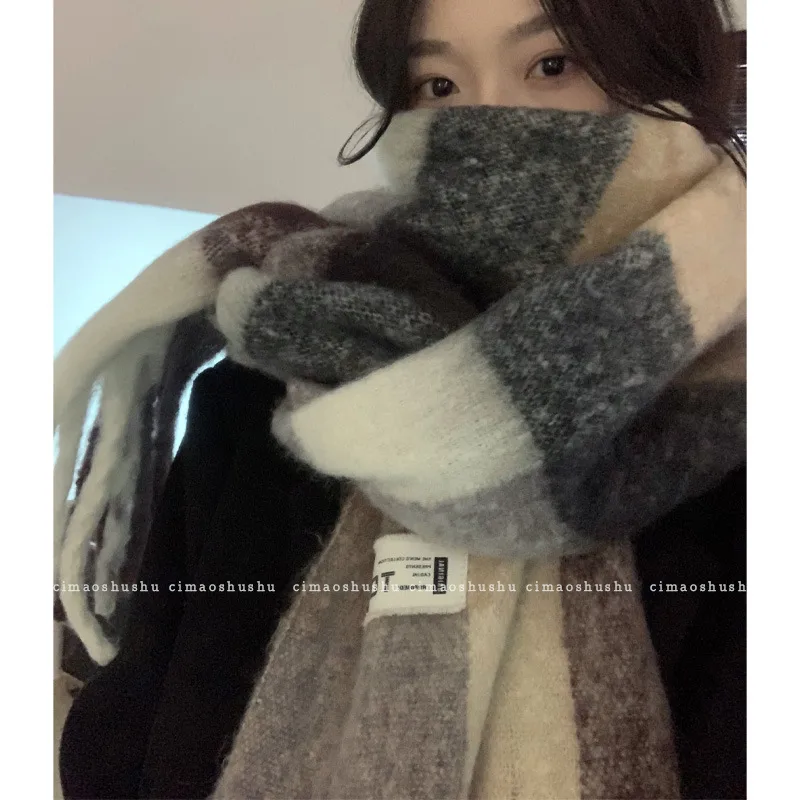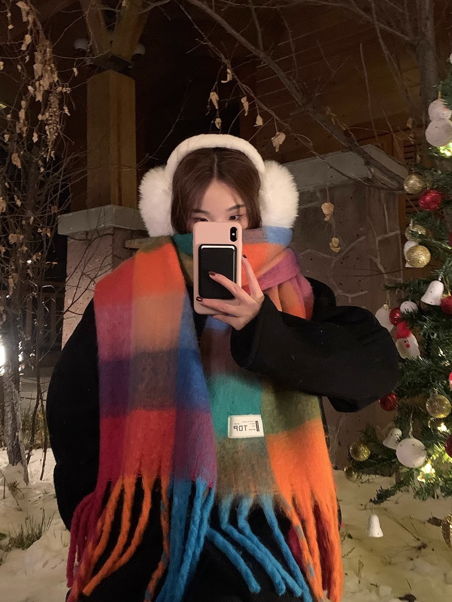 The Casava Thickened Scarf is a high-value winter accessory featuring a vibrant rainbow color-block plaid design. Made with a soft mohair and cashmere blend, this lined scarf provides extra warmth and comfort, making it perfect for stylish women during cold seasons.