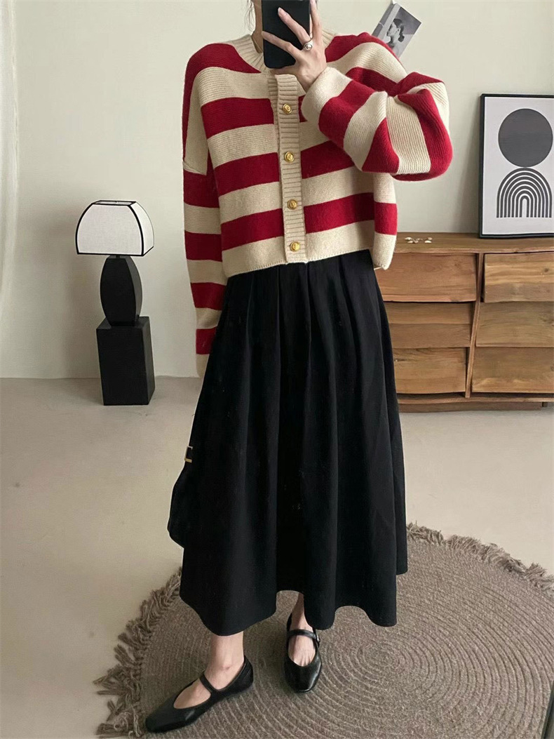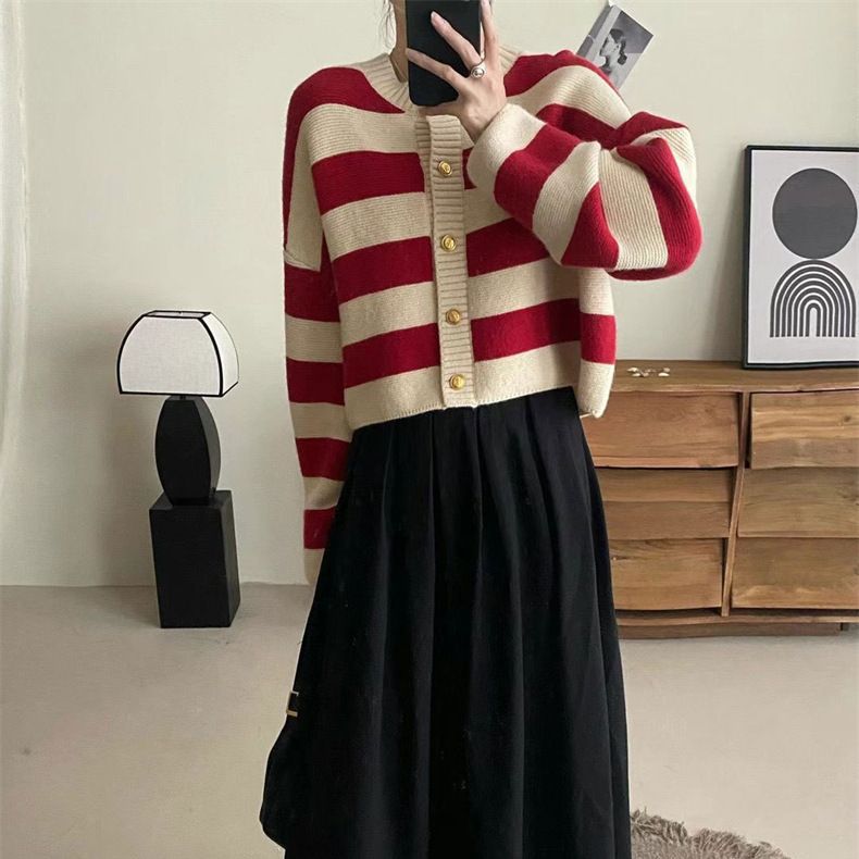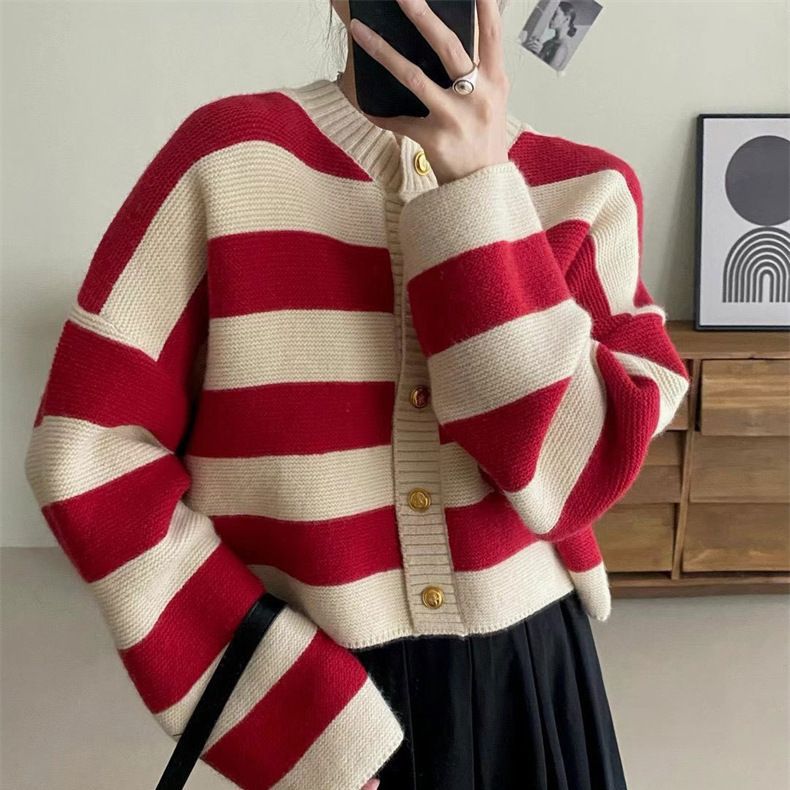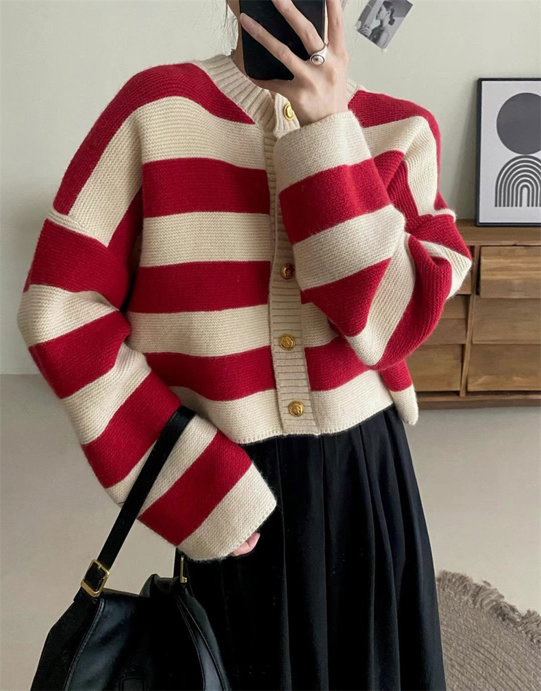 A soft and stylish striped knitted cardigan featuring a lazy, youthful design with contrast binding details. Perfect for autumn, this women’s sweater coat combines comfort and elegance with its round neck, long sleeves, and regular fit. Made from a cozy blend of polyester, polyacrylonitrile fiber, and knit fabric for a gentle, slimming look.