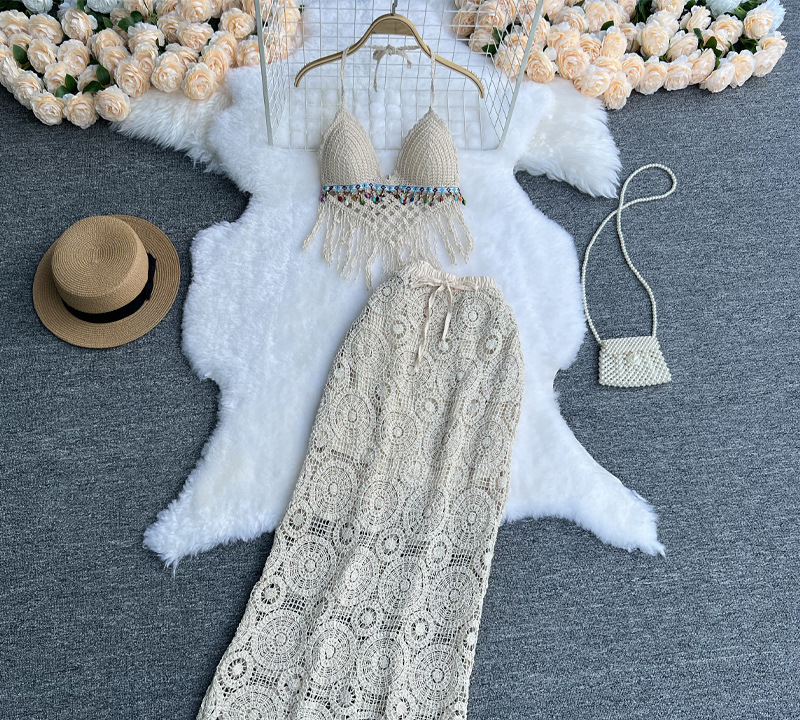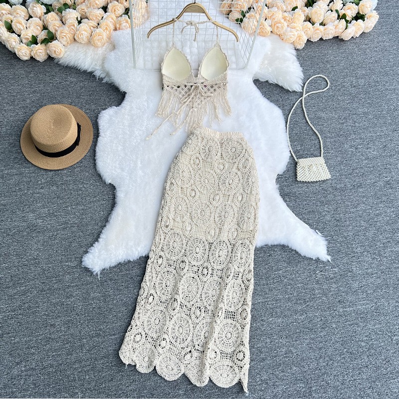 Size: One Size change Color: Apricot change The Casava Hollow Out Skirt Co-ord Set is a chic two-piece summer outfit designed for comfort and effortless style. Featuring a sleeveless halter top and matching hollow-out tassel skirt, this polyester co-ord set is perfect for daily wear or vacation outings, offering a casual yet fashionable look.