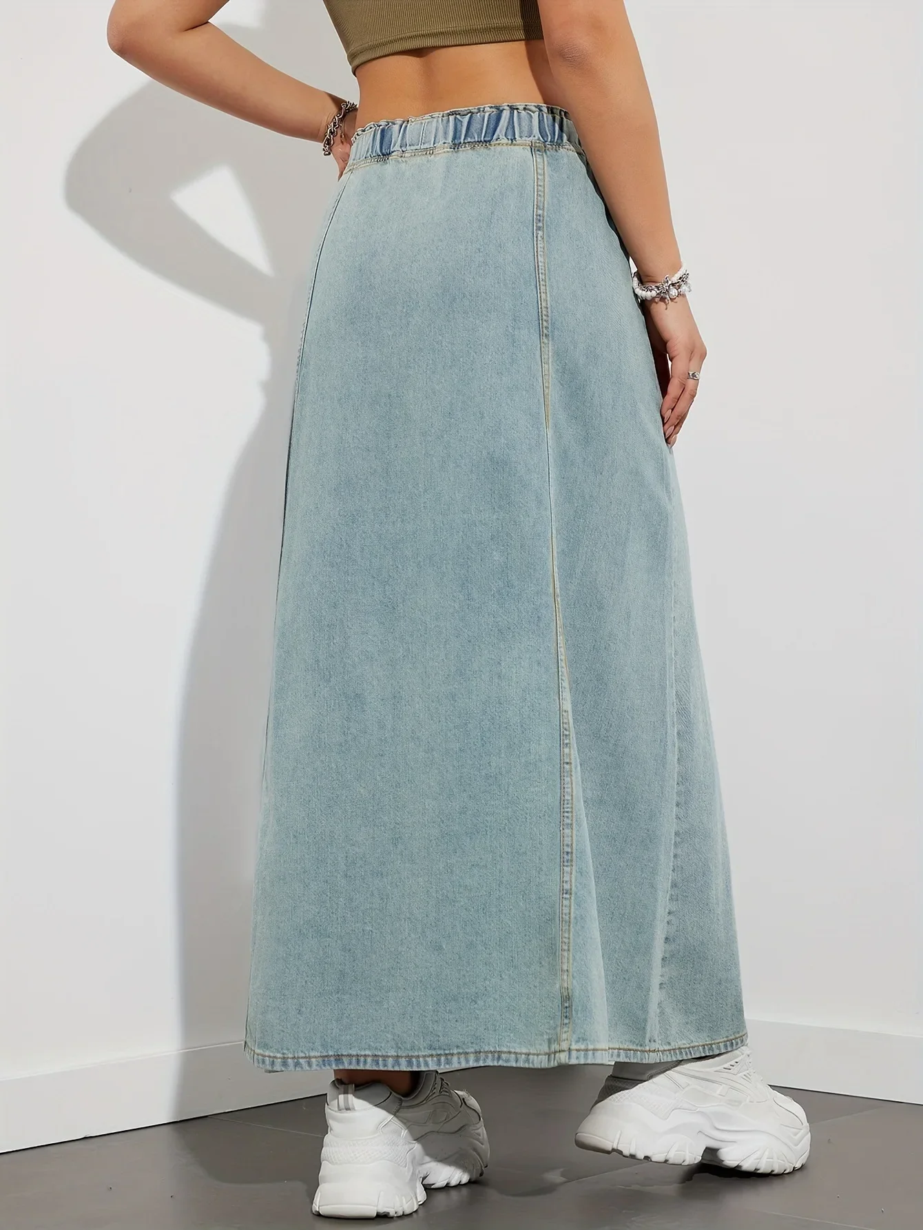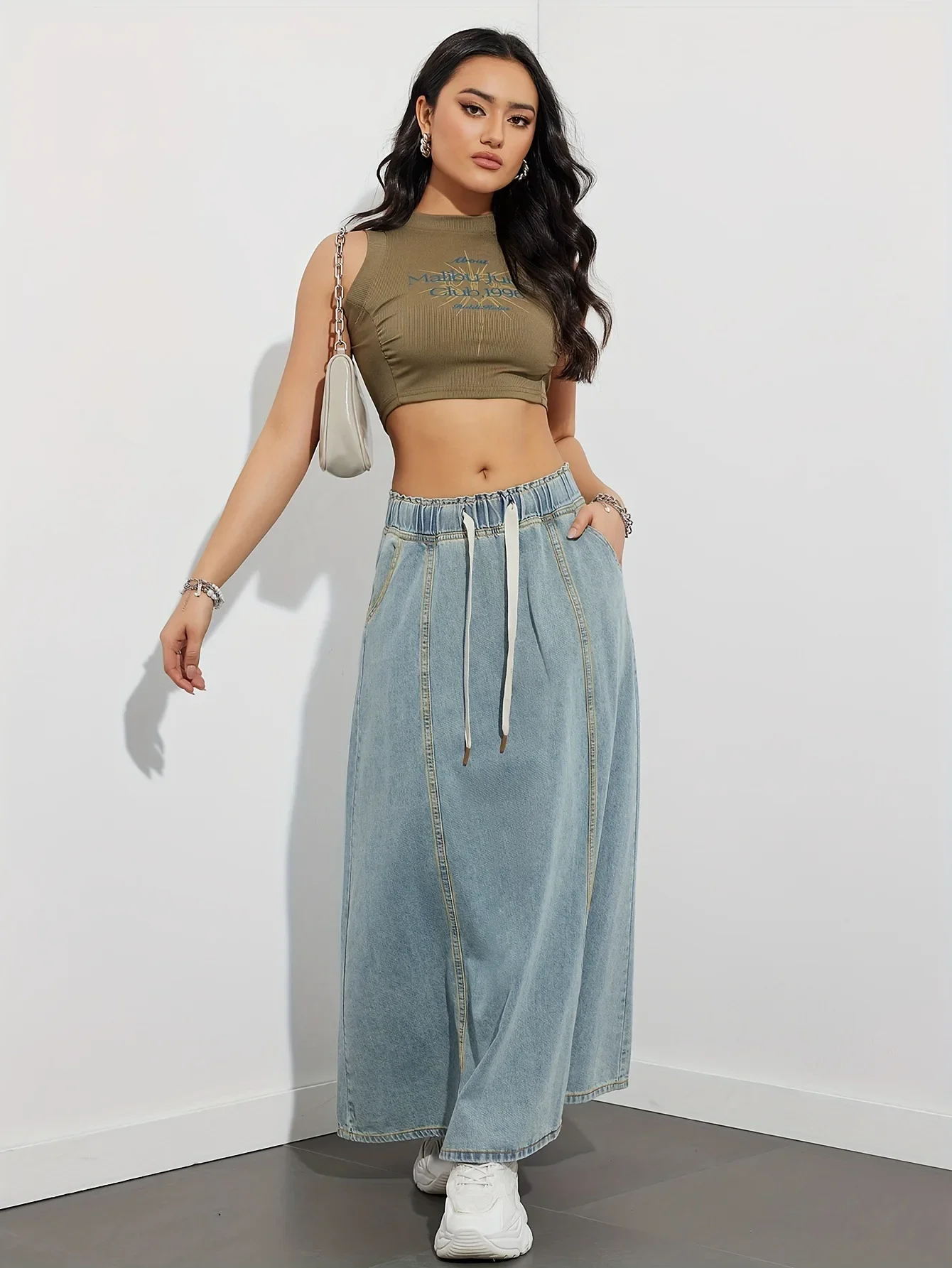 Add effortless charm to your wardrobe with the American Design Sense Loose Waist Denim Skirt. This casual, streetwear-inspired long skirt features a large swing A-line silhouette and an elastic waist for all-day comfort. Crafted from a blend of cotton, denim, and viscose fiber, it’s perfect for relaxed days with a touch of timeless style.