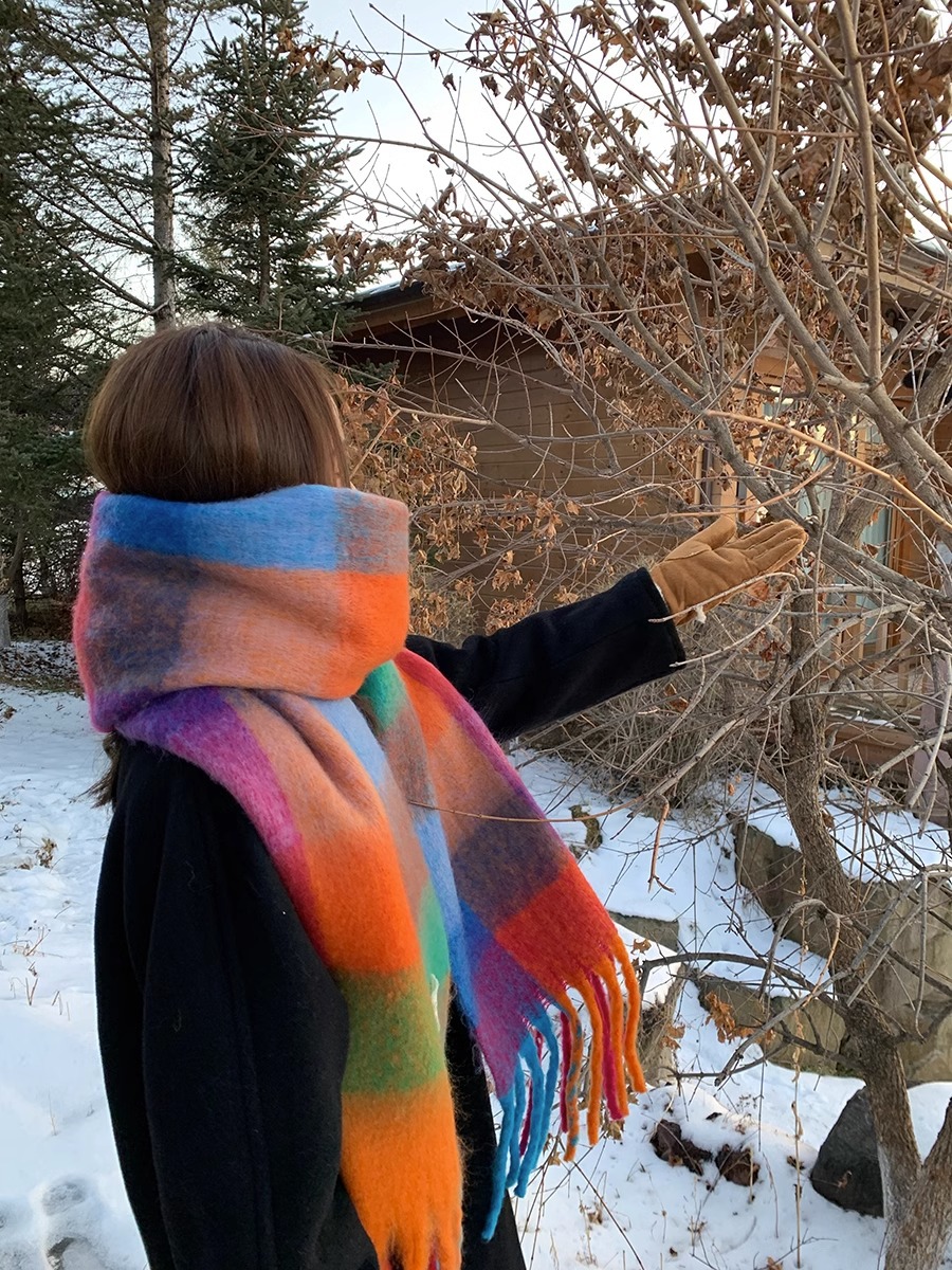 The Casava Thickened Scarf is a high-value winter accessory featuring a vibrant rainbow color-block plaid design. Made with a soft mohair and cashmere blend, this lined scarf provides extra warmth and comfort, making it perfect for stylish women during cold seasons.
