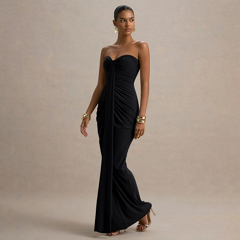 The Casava Sleeveless Color Slim Dress delivers modern European elegance with a sleek, body-hugging silhouette. Designed with a pleated wrap-around ribbon accent, this chic sleeveless dress blends sophistication and streetwear flair. Its smooth spandex–polyester fabric enhances comfort and stretch, while the boat neck/tube-top style adds a refined yet bold touch. Perfect for evenings out, special events, or fashionable everyday wear.