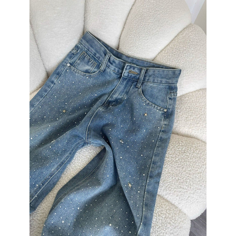 Size: S change S M L XL XXL Color: Light Blue change The Casava Rhinestone Denim Jeans bring sparkle and sophistication to casual wear. Designed with dazzling rhinestone detailing and a flattering high waist, these straight-cut, loose-fit jeans combine elegance with comfort — perfect for both pear-shaped and petite figures.