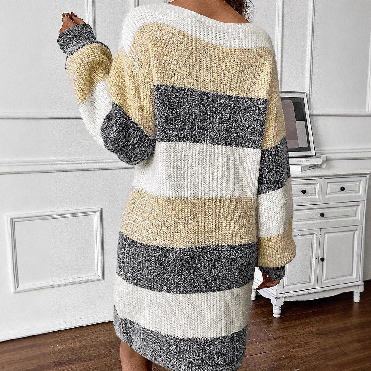 Size: S change S M L XL Color: Stripe change The Casava Knitted Midi Sweater Dress blends cozy comfort with stylish patchwork color-block detailing. Featuring a round neck, long sleeves, and a soft knitted finish, this above-knee dress offers a relaxed yet fashionable fit—perfect for autumn and winter casual outings with a touch of Japanese-inspired leisure style.