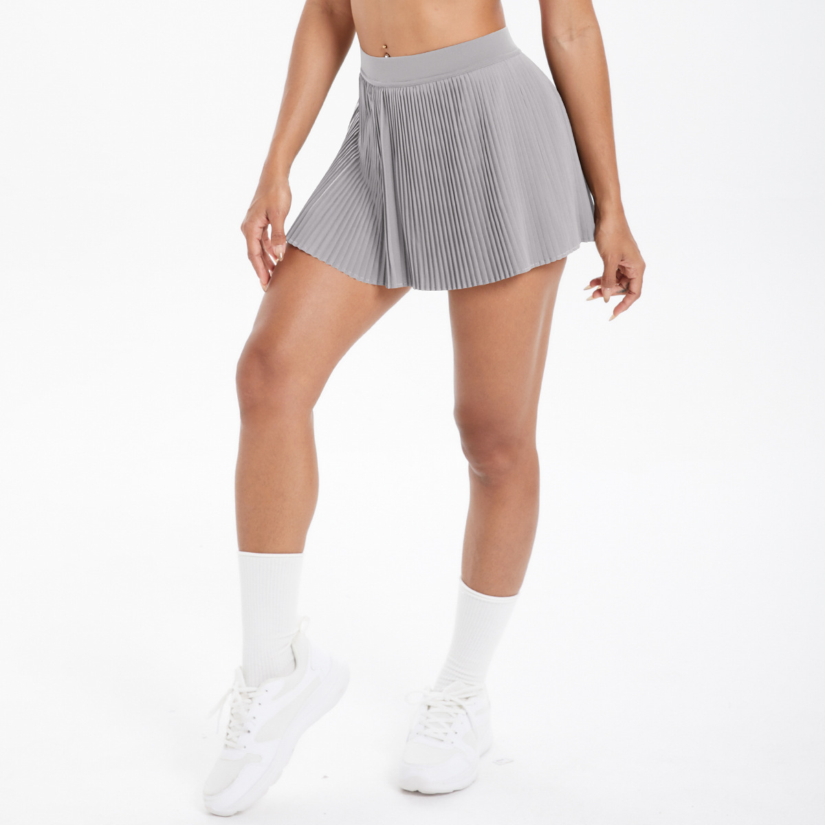 The Casava Crimp Pocket Two-Piece Set is a sporty women's yoga outfit featuring a high-waist skirt and multifunctional culottes. Made from stretchy nylon and spandex, it’s perfect for running, fitness, and active workouts, with a stylish stripe design and sleeveless top.
