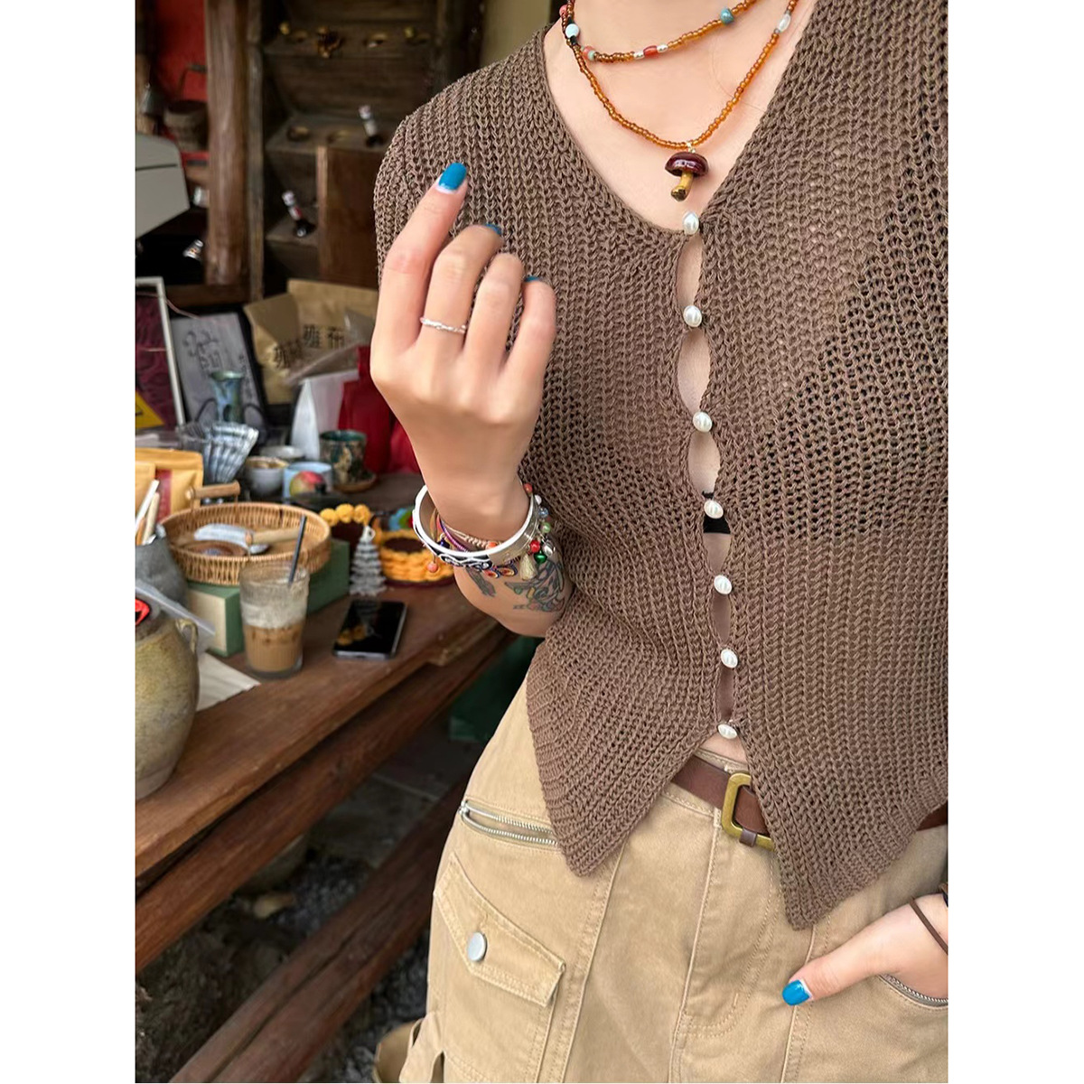 A fashionable and sweet knitted cardigan for women, featuring a pure desire style with a slim fit and V-neck design. This short-sleeve summer cardigan is detailed with elegant pearl buttons and a single-breasted front. Made from soft polyester, it offers a fresh and feminine look perfect for casual or chic occasions.