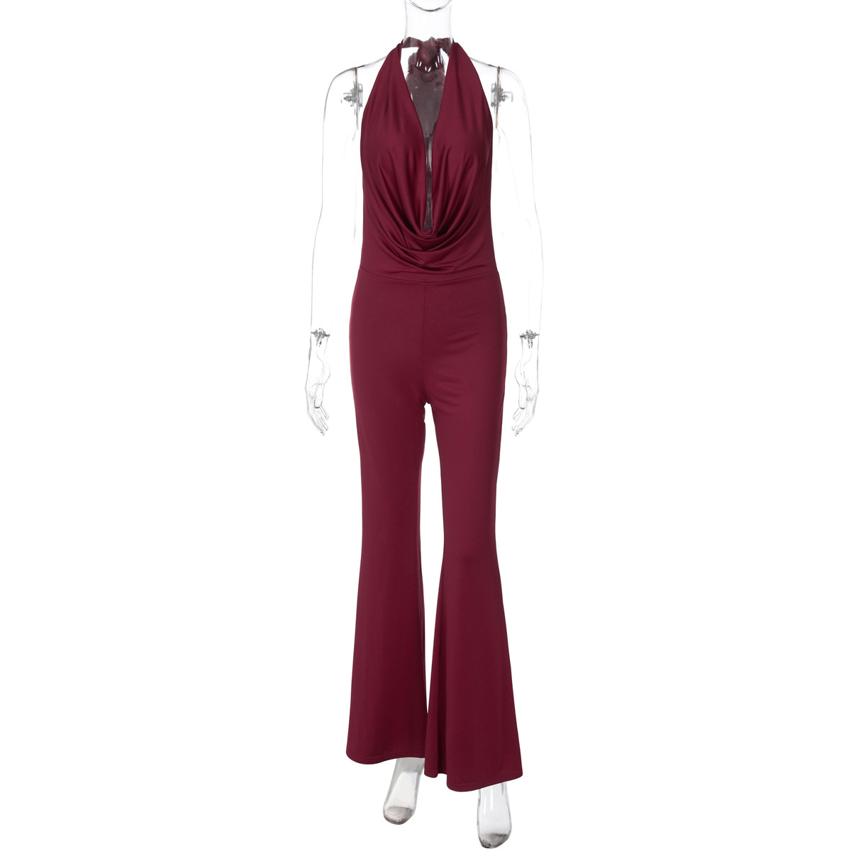 Size: M change M L Color: Wine Red change The Casava One Piece Pants delivers a sleek and seductive silhouette with its slim-fit, backless design and halter neck bow detail. Crafted from a high-elastic spandex–polyester blend, this solid-color jumpsuit combines European street fashion with all-day comfort, making it ideal for confident daily wear.
