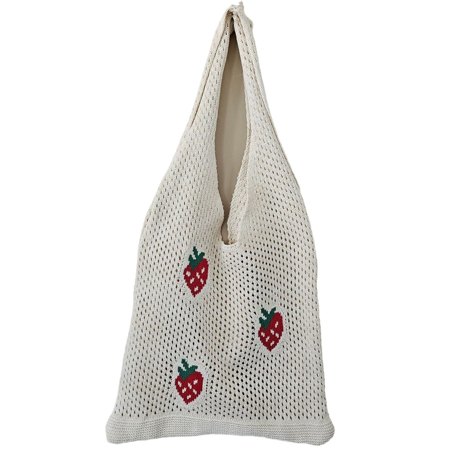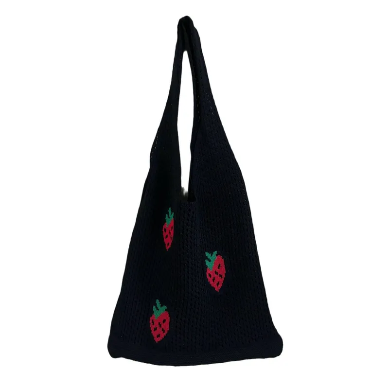 The Casava Strawberry Tote Bag is a cute medium-sized polyester handbag designed for daily use. Featuring a strawberry pattern, square shape, and open-top design, it offers a playful yet practical look. Its single shoulder strap makes it easy to carry, making it a charming everyday accessory.