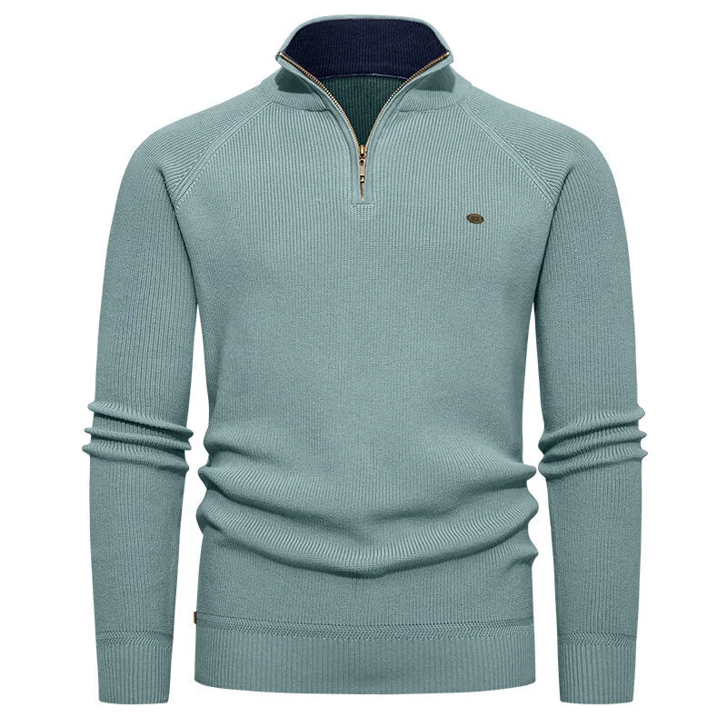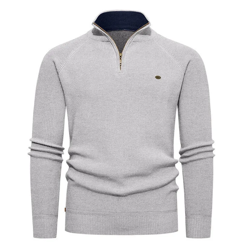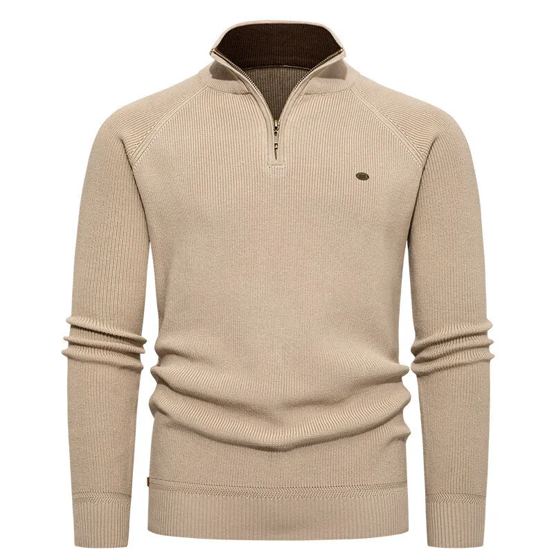 The Casava Thickened Knitted Sweater is a men’s slim-fit winter pullover with a half zipper and stand collar. Designed with vertical ribbing, it provides warmth and style for casual occasions.