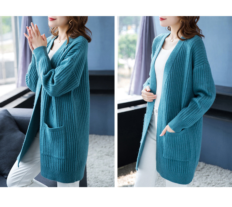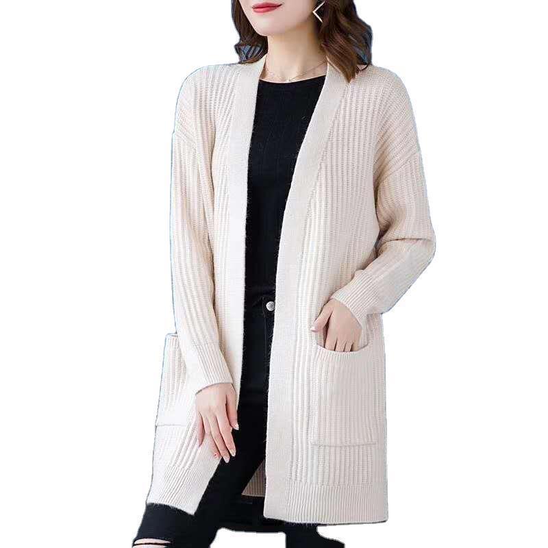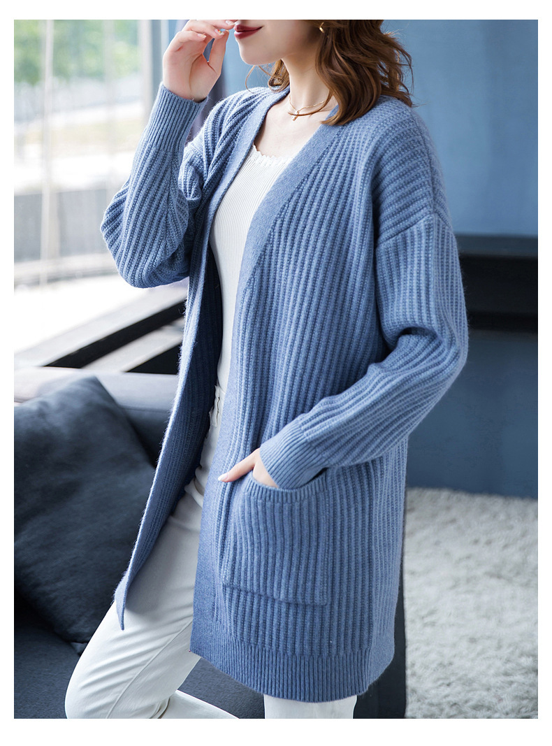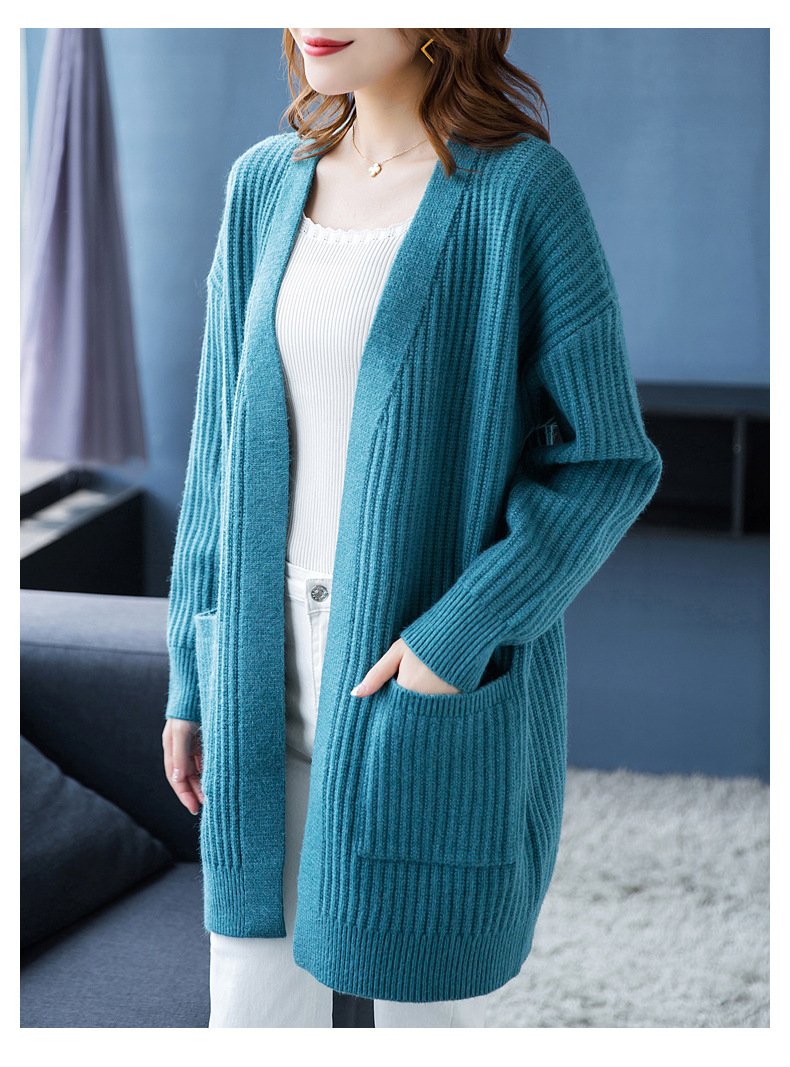 A cozy and stylish fall knitted cardigan featuring a relaxed, lazy-wind design. This loose mid-length outerwear sweater for women comes with a flattering V-neck and long sleeves, perfect for layering in cooler weather. Made from soft polyester knitwear with a 3D textured finish for effortless comfort and chic commuter style.