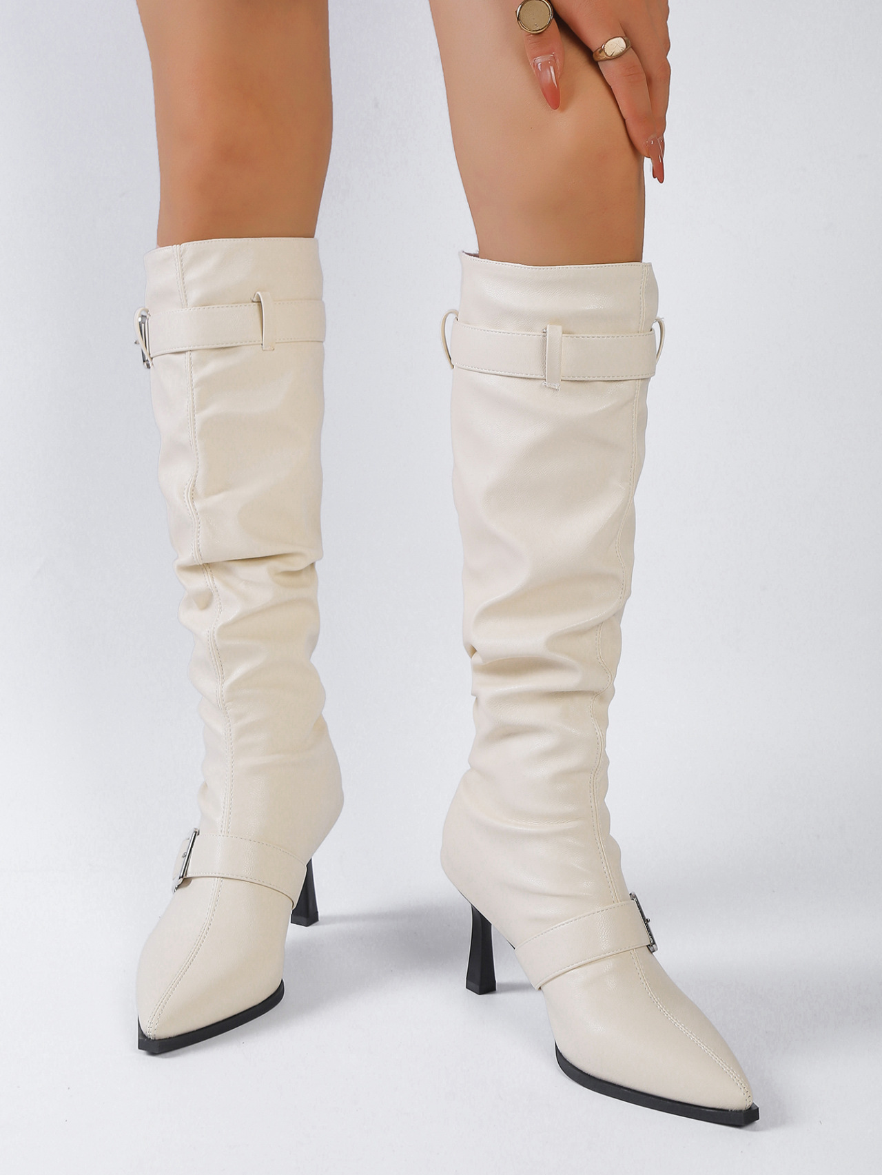 The Casava Elevé Buckle High-Tube Fashion Boots are designed to deliver elegance and a powerful silhouette. Featuring a pointed toe, sleek stiletto high heel, and pleated high-tube design, these boots instantly heighten and slim the look. Crafted from smooth PU leather with a comfortable PU leather insole, soft cloth lining, and durable rubber outsole, they are perfect for autumn, winter, and spring styling. The slip-on design and refined belt buckle detail complete this modern fashion statement.