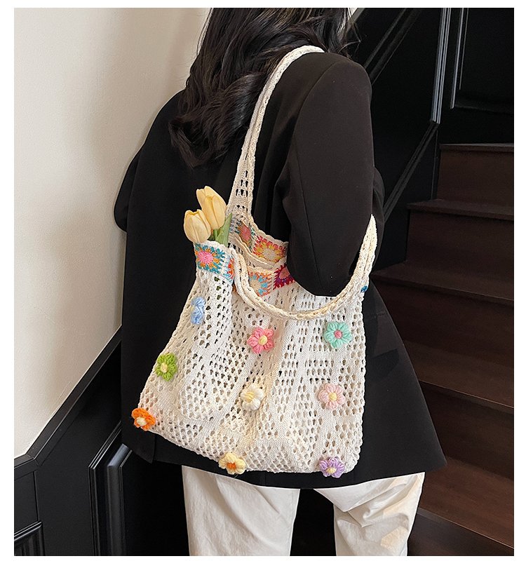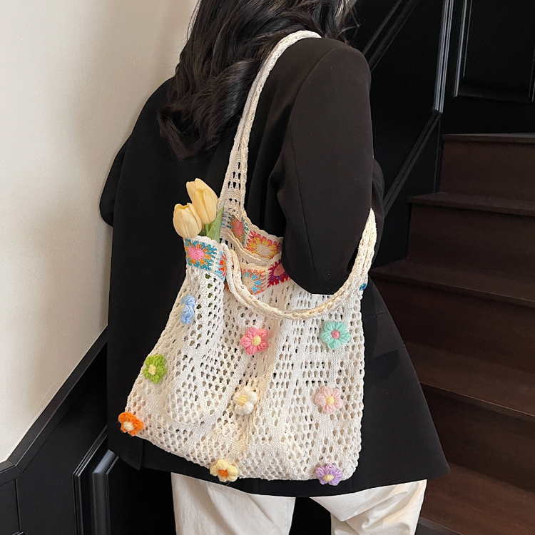 Bring a touch of handcrafted charm to your warm-weather looks with this Women’s Knit Flower Vacation Square Open Tote Bag. Designed for spring and summer, it features a lovely floral knit pattern that adds softness and personality to any casual outfit. The spacious square shape and double shoulder straps make it perfect for beach days, brunch outings, or everyday errands. Lightweight and easy to carry, this open-top tote is an ideal companion for relaxed vacation style.