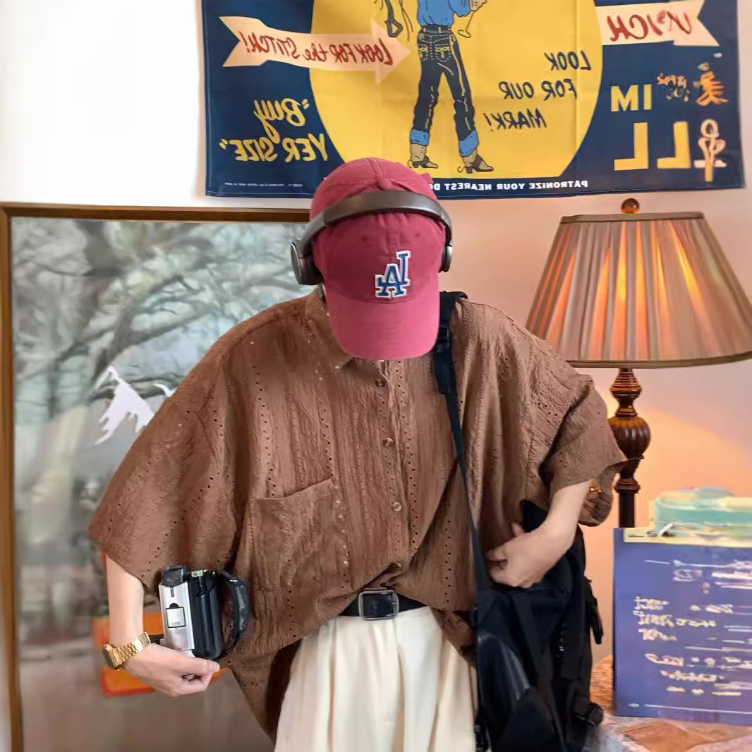 A retro-inspired men’s short-sleeved hollow shirt featuring a relaxed, lazy fit with a unique square neckline. Made from lightweight polyester with a printed texture, this trendy casual shirt is perfect for summer comfort and effortless street style.