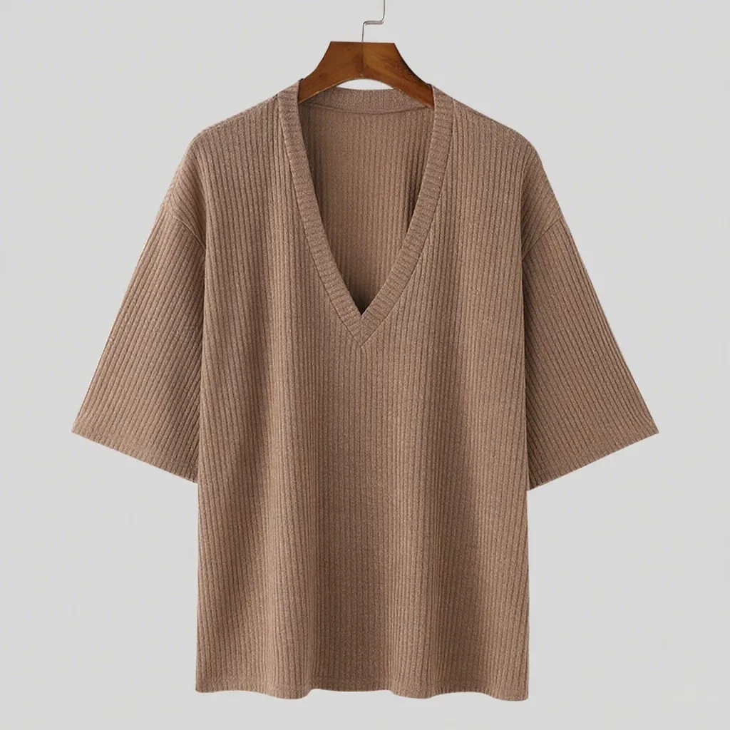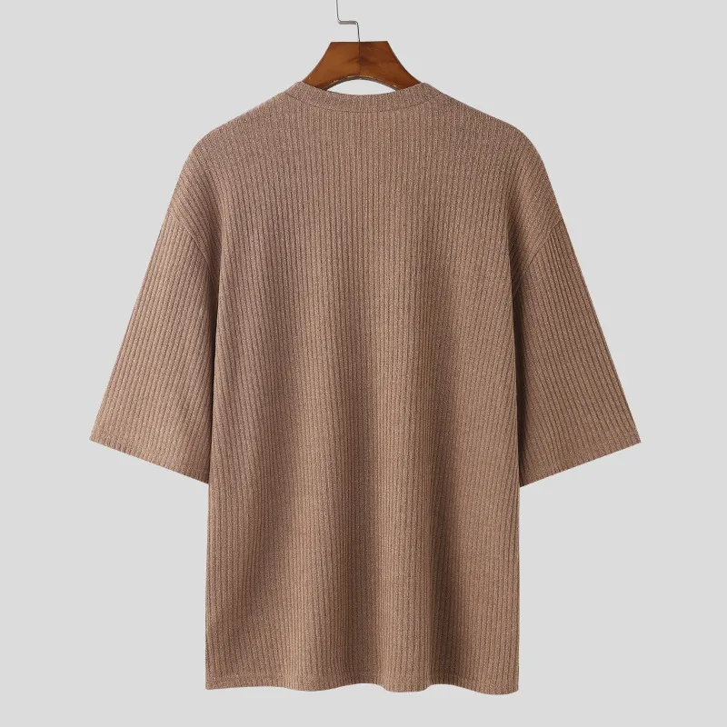 The Casava Casual V-Neck Knitted T-Shirt is a lightweight and relaxed summer essential for men. Designed with a loose fit, mid sleeves, and a soft rib-knit polyester fabric, it offers breathable comfort for everyday wear. Its clean solid-color design and collarless V-neckline create a simple yet stylish casual look.
