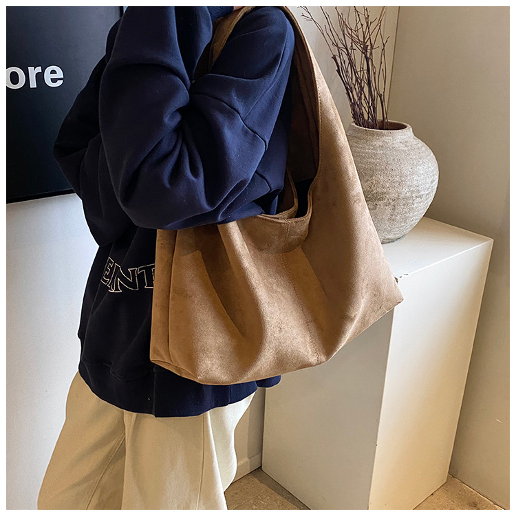 An elegant women’s suede shoulder tote bag featuring a soft matte texture and refined stitching details. Designed with a large capacity and single shoulder strap, this high-quality commuter bag perfectly complements autumn and winter outfits with timeless sophistication.